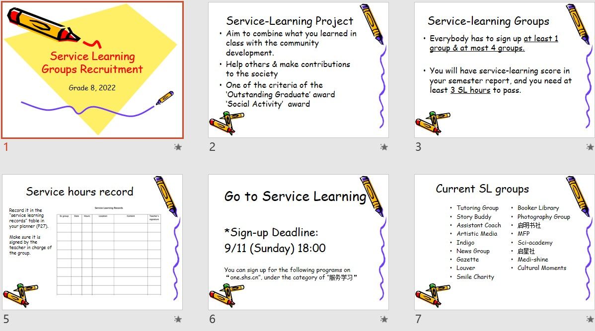 八年级的服务型学习项目种类繁多,Tutoring Group、故事哥哥姐姐、微笑社等金标项目,预计在本学年也将受到大家的喜爱。部分同学们也将创建全新的项目,期待他们可以做出新的成就!