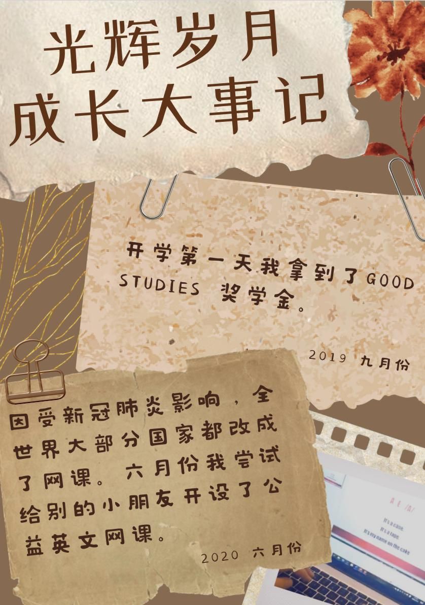 除了用文字来抒发自己对往昔岁月的感受,记忆影像的拼接也是记录的方式之一。为了让学生们能够在未来某时,翻开这些纸张的刹那就能回到现场,本次活动的第二部分,围绕“光辉岁月”这一主题,将成长路上的那些刻骨铭心的事迹进行记录。在大家的作品中,有很多温馨且让人感动的“第一次”:比如第一次艺术节上的班级表演、第一次全班一起疫情隔离、第一次“搬楼”,第一次加入社团并获得比赛的胜利……这些质朴但不平凡的小事共同谱写出了独属于学生们自己的“光辉岁月”,大家也在图像的翻阅查找中,将自己特别的回忆进行珍藏。