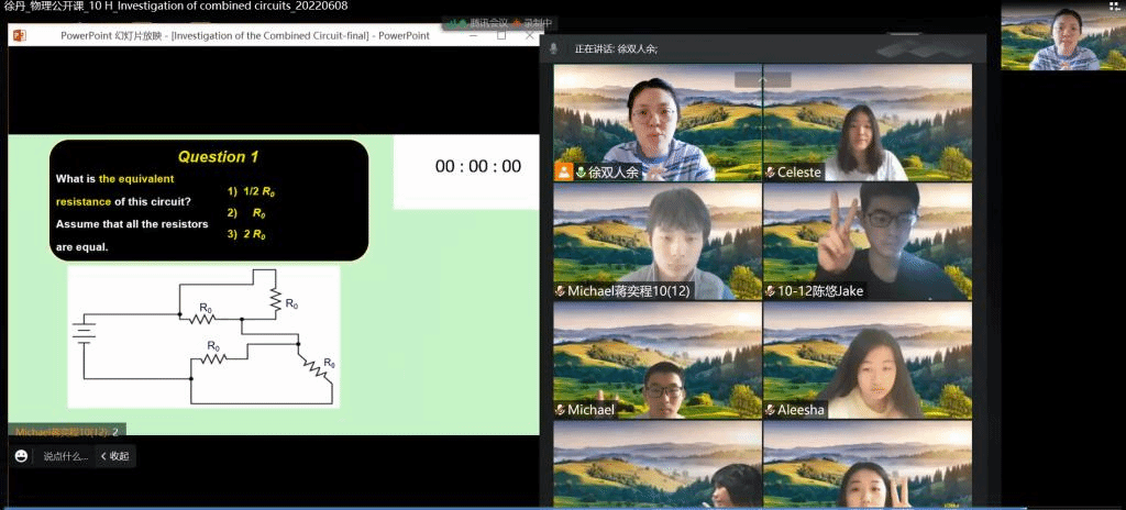 2022年6月8日上午,国际部高中物理组徐丹老师在腾讯会议室开设了主题为“混联电路”的线上公开课。混联电路属于本学期10年级物理教学的难点内容,也是跟我们的生活息息相关的热门课题,因此,本堂公开课吸引了众多包括其他学科老师在内的老师们前来聆听。