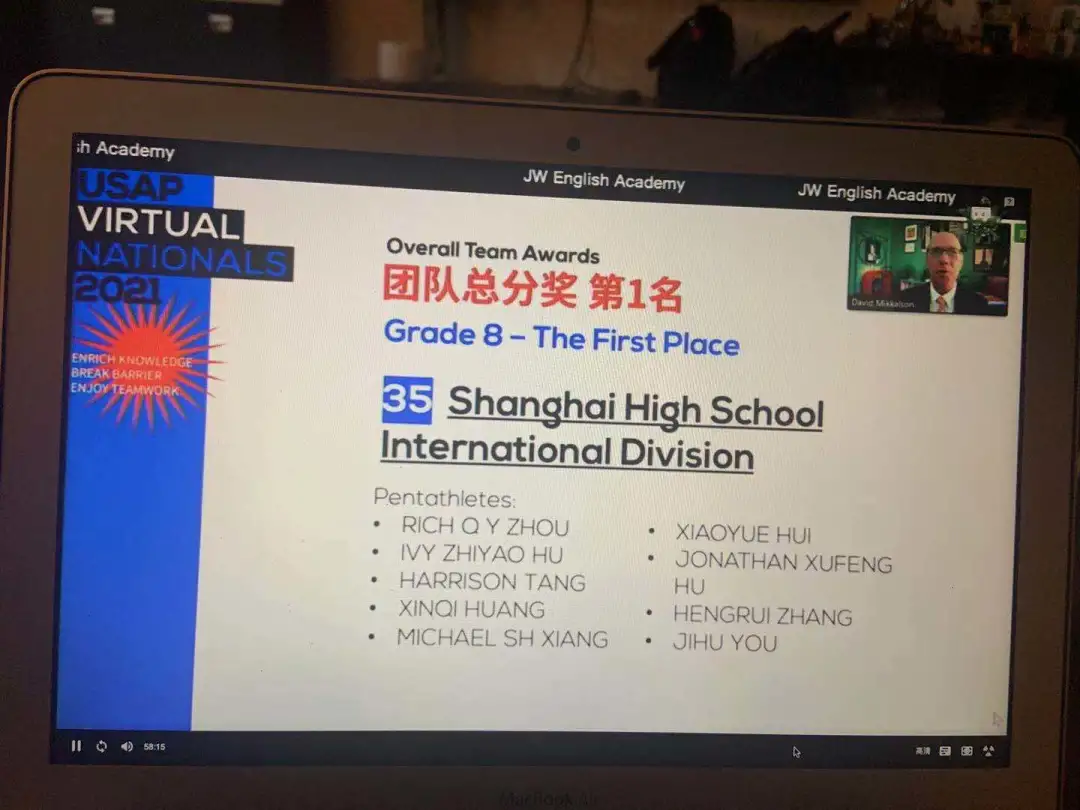 6月5日,USAP全球站线上颁奖典礼如约而至。傍晚7点50分,老师和同学们陆陆续续进入直播间,带着些许紧张,满怀期待地等待比赛结果的到来。终于,颁奖典礼正式开始了。每一次听到主持人宣布获奖者是队友时,同学们欣喜若狂,在微信群里一起“呼喊”着他们的名字,并表示祝贺。整个颁奖过程充满了喝彩与欢呼,每个人都沉浸在成功和喜悦之中。