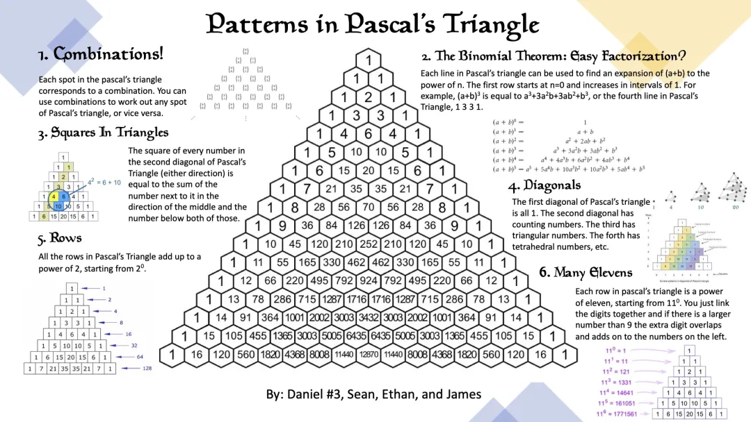 在过去的两周里,七年级的同学们参与了一次别出心裁的综合课题——数学盲盒。不同于以往学生们关注同一个课题内容,此次课题采用盲盒抽签形式,内容多种多样,包含帕斯卡三角形里的规律,勾股定理的原理,体积最大化,和图形几何变化。同学们自主组队,每队4到5人进行课题合作。根据不同的课题,每组的要求也有所变化。有的需要制作海报,有的需要制作演示幻灯片,有的需要撰写文章进行论述……