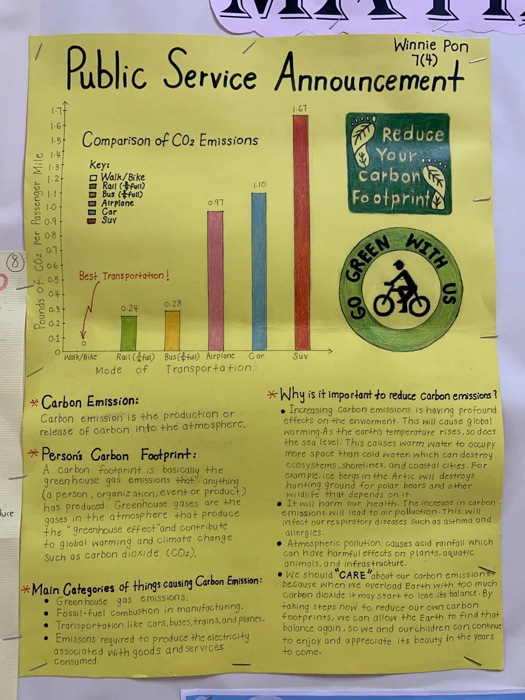 在过去的一个月里,七年级的同学们参与了一个创新性的数学课题——低碳生活。这是一个综合项目,主要以“节约和减少每个人每天的碳足迹”为主题展开讨论。题目从简到难,一共分成了4个部分。在第一部分“飞机、火车和汽车”中,学生需要计算三个截然不同的人在他们交通出行方面的碳排放量。与此同时,学生们理解了碳大量排放的严重后果,包括冰山融化,季节变换,甚至是风暴的出现等等。这一部分提供的一个关于不同交通工具的碳排放量的表格引发了同学们的深思。第二部分则从交通转向了食品。在“旅游食品”部分中,学生计算了生产和运输食品所排放的碳量,了解到即使是食品或货物也会产生或多或少的碳排放量。在第三部分“你生命中的一天”,学生们填写了一张记录自己每日碳足迹的表格。这一环节使学生能够深刻反思自己的每日碳足迹。课题的最后一个部分,学生们将自己了解的碳足迹过程整理归纳,以小报或视频的形式呼吁他人减少自己的碳足迹。在整个项目的最后,学生需要完成一个自我发思,来归纳以及整理自己在这个课题中的得失,这个过程提高了学生批判性思考的能力。