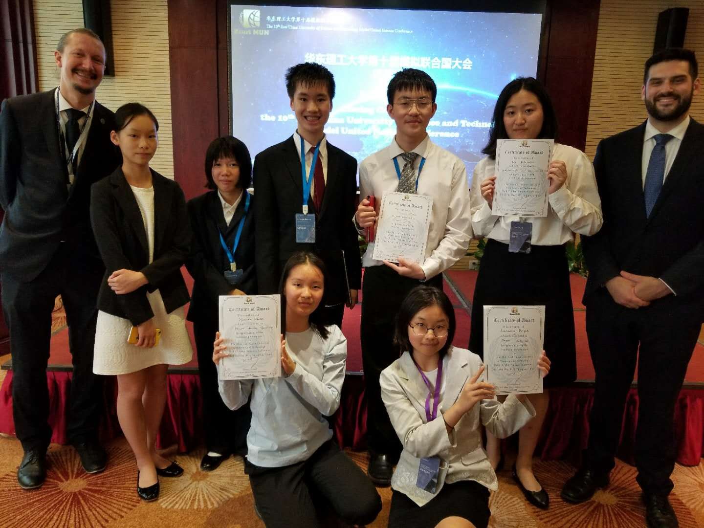 5月底,第十届华东理工大学模拟联合国大会正式开幕。参加此次模联大会的代表有来自各所大学,如东华大学、华东政法大学等,而上海中学国际部的一支初中队伍在此次大会上收获颇丰。经过三天激烈的讨论与决议草案的修改,上中国际部被评为“最佳代表团”,在7人组成的团队中有3位代表获奖。8(9)班的路同学被评为杰出代表,8(1)班胡同学与7(5)班的张同学获得荣誉提名奖。恭喜他们!