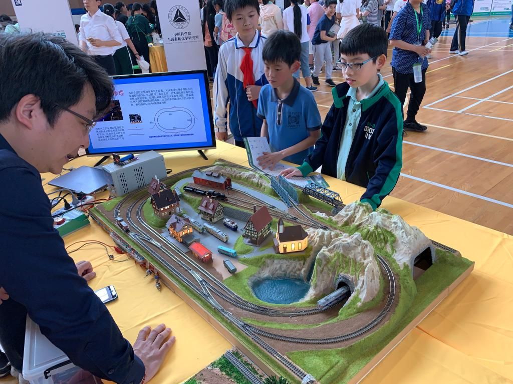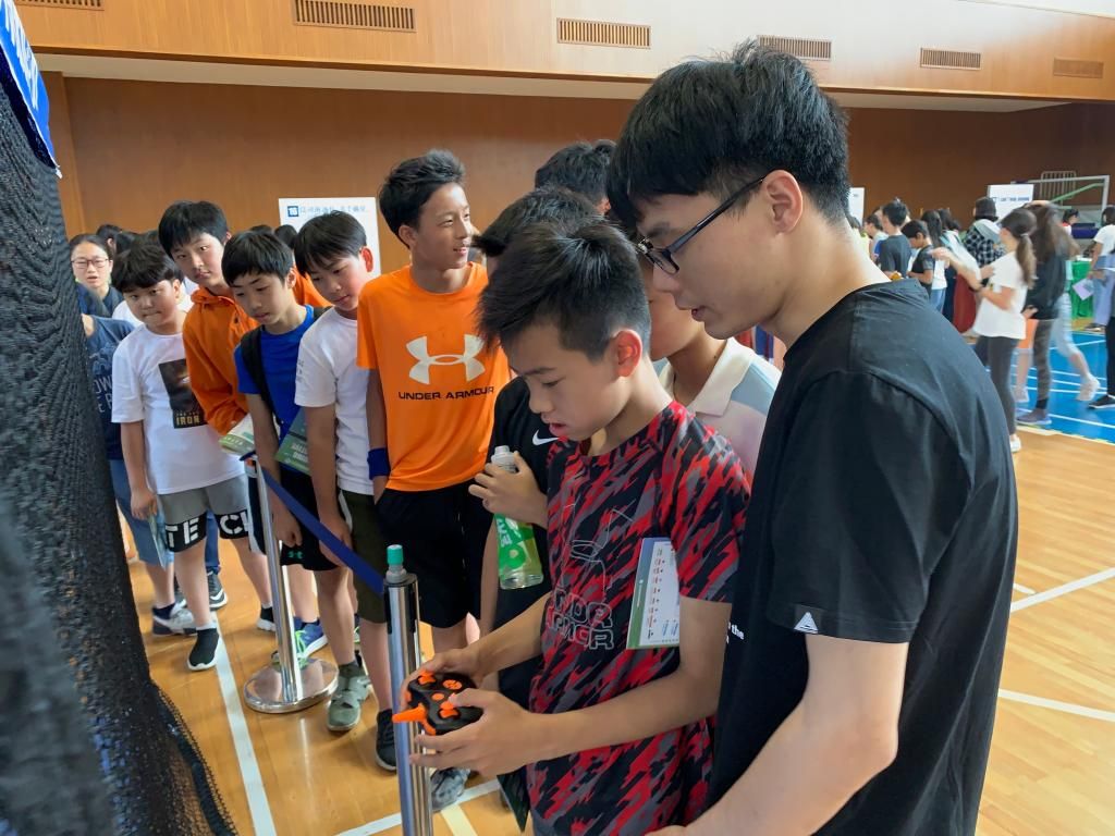 当然,场馆中央的人工智能和无人机展示区也绝对不能错过。同学们在这些展位前参加了许多有趣的活动,比如操作机器人拿球,控制电极轨道驾驶火车等。在这些活动中,最有趣当属无人机竞速飞行了。学生们控制一架无人机飞过一个较简单的障碍飞行场地并顺利返回降落。