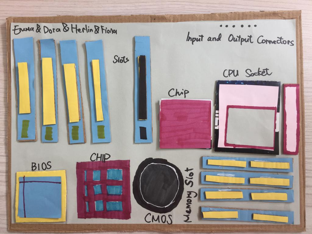 本学期,六年级的电脑课采用项目式学习法来让学生学习计算机硬件知识。和以往的教学方式不同,在课堂上,学生们被分成小组,各个小组在老师的启发下自主进行讨论、搜集资料、制作PPT、制作电脑模型、进行演讲和互相评分。在课程中,学生按要求需要采用自己熟悉的材料制作计算机的主板,搜集资料了解计算机主板的功能和重要组成部分,制作PPT,然后每个小组在课堂上进行模型的展示和讲解。在项目式学习的最后,学生需要进行自评和互评。和以往教学模式不同,学生在项目式学习的课堂上,讨论更多、合作更多、参与更多、收获也更多。