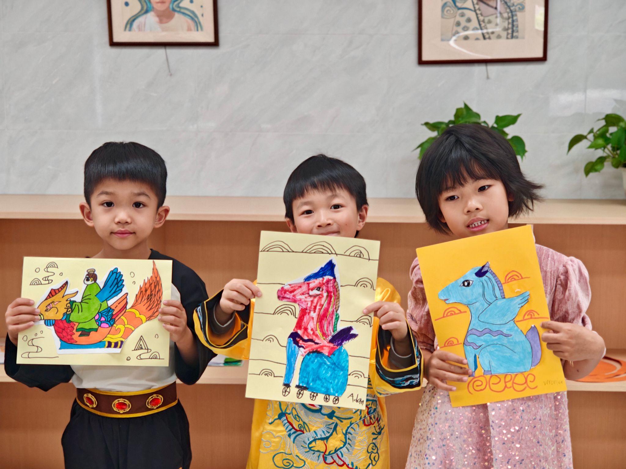 周三,孩子们的目光聚焦于故宫屋脊上的祥瑞脊兽。通过生动的视频和讲解,大家认识了骑凤仙人、狻猊、獬豸等神兽的传说与象征意义。随后,学生们选择了自己最喜欢的脊兽,为其涂上鲜艳的色彩,并写下选择理由,在绘画中感受传统文化的独特魅力。