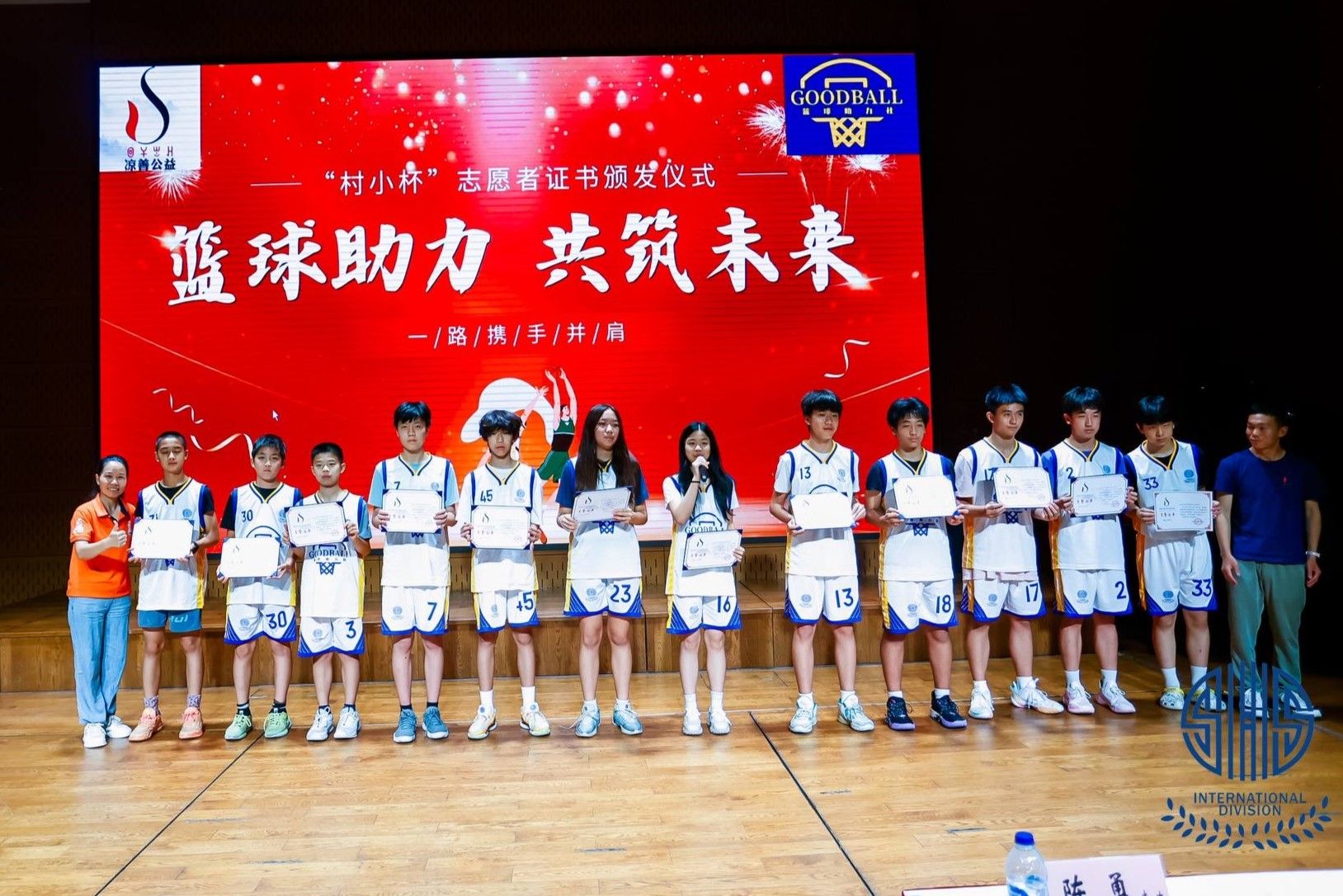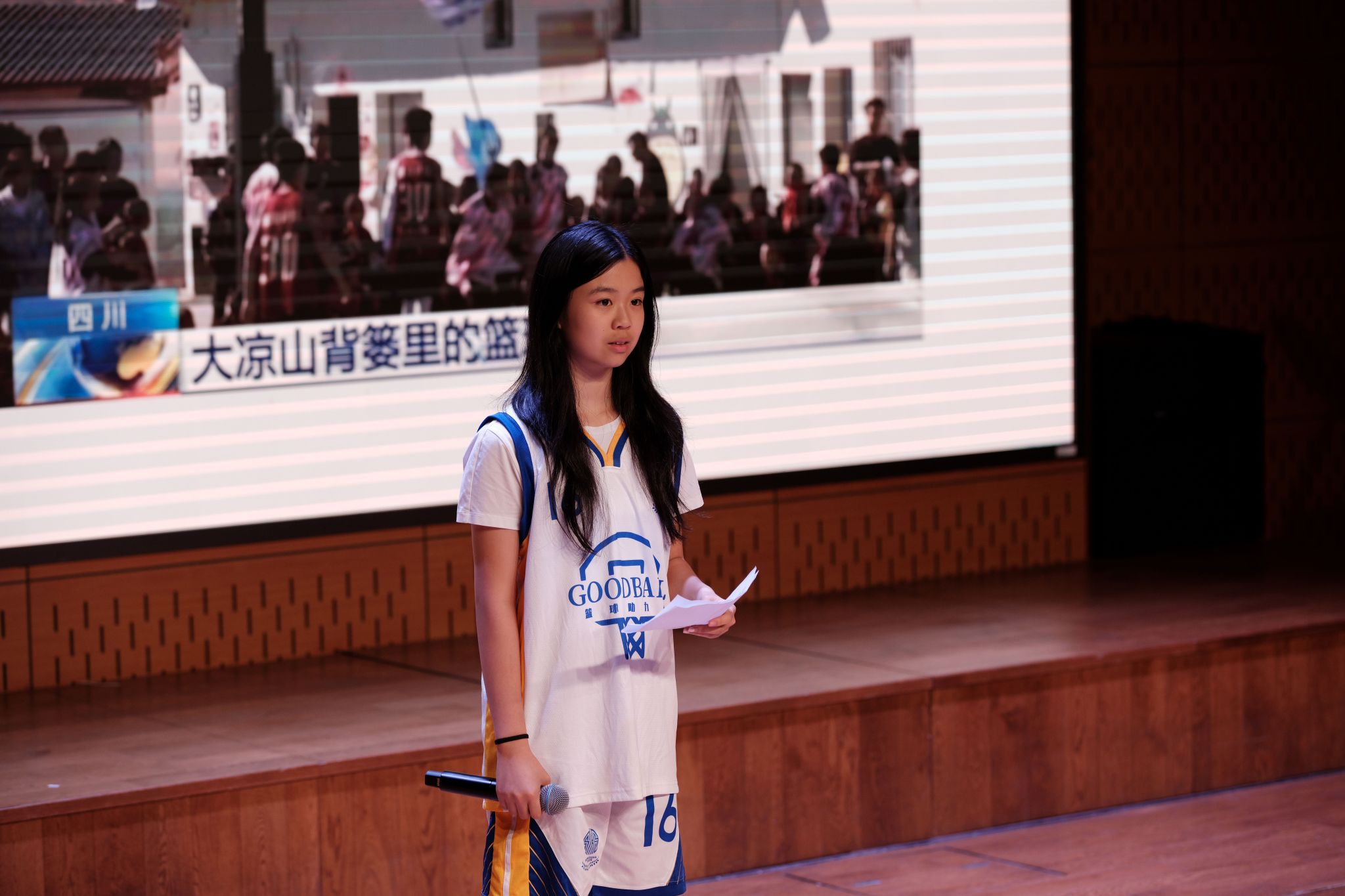 音乐余韵未散,8-2 Stephanie与8-7 Runyao登台介绍了Goodball小组以及组员们的四川大凉山篮球公益行。本次音乐会也很荣幸地请到了凉善公益促进会副秘书长廖向莉女士和大凉山的师生们来到这欢乐的现场,共享艺术盛宴。在Goodball小组分享后,廖向莉女士和大凉山塔哈村小学校长许定奎老师为小组成员们颁发了“村小杯”志愿者证书。
