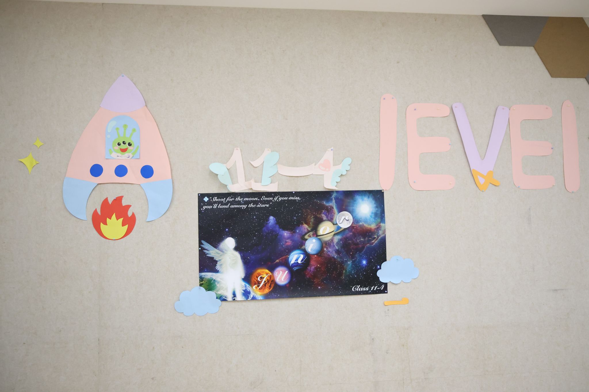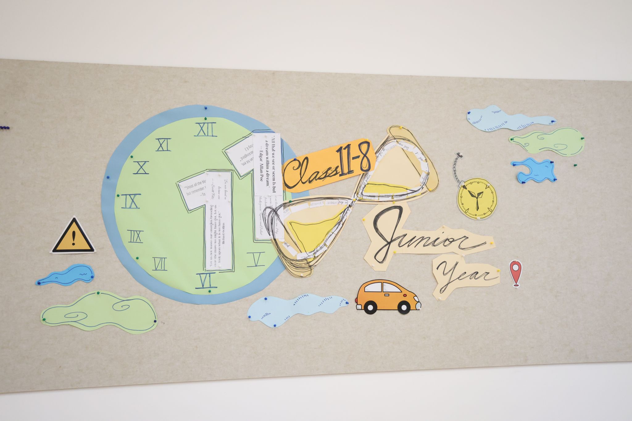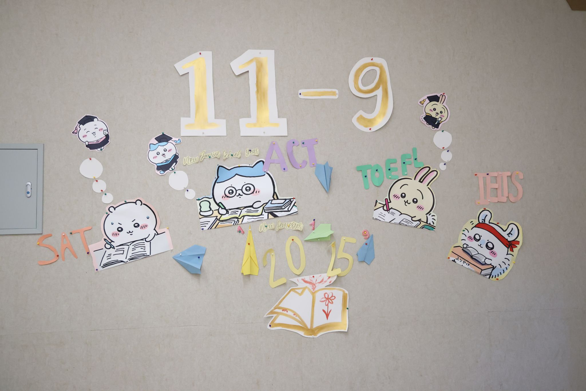 11(8)班以 “时间流逝” 为核心主题,将对时光的思考融入视觉设计。板报整体风格简洁大气,没有冗余装饰,用极简设计承载了丰富的情感与思考。11(9)班则走温馨可爱的卡通风路线,将当下备受喜爱的卡通形象作为创作主角。有的捧着书本认真阅读,有的握着笔在笔记本上书写,还有的围坐在一起仿佛在讨论难题。