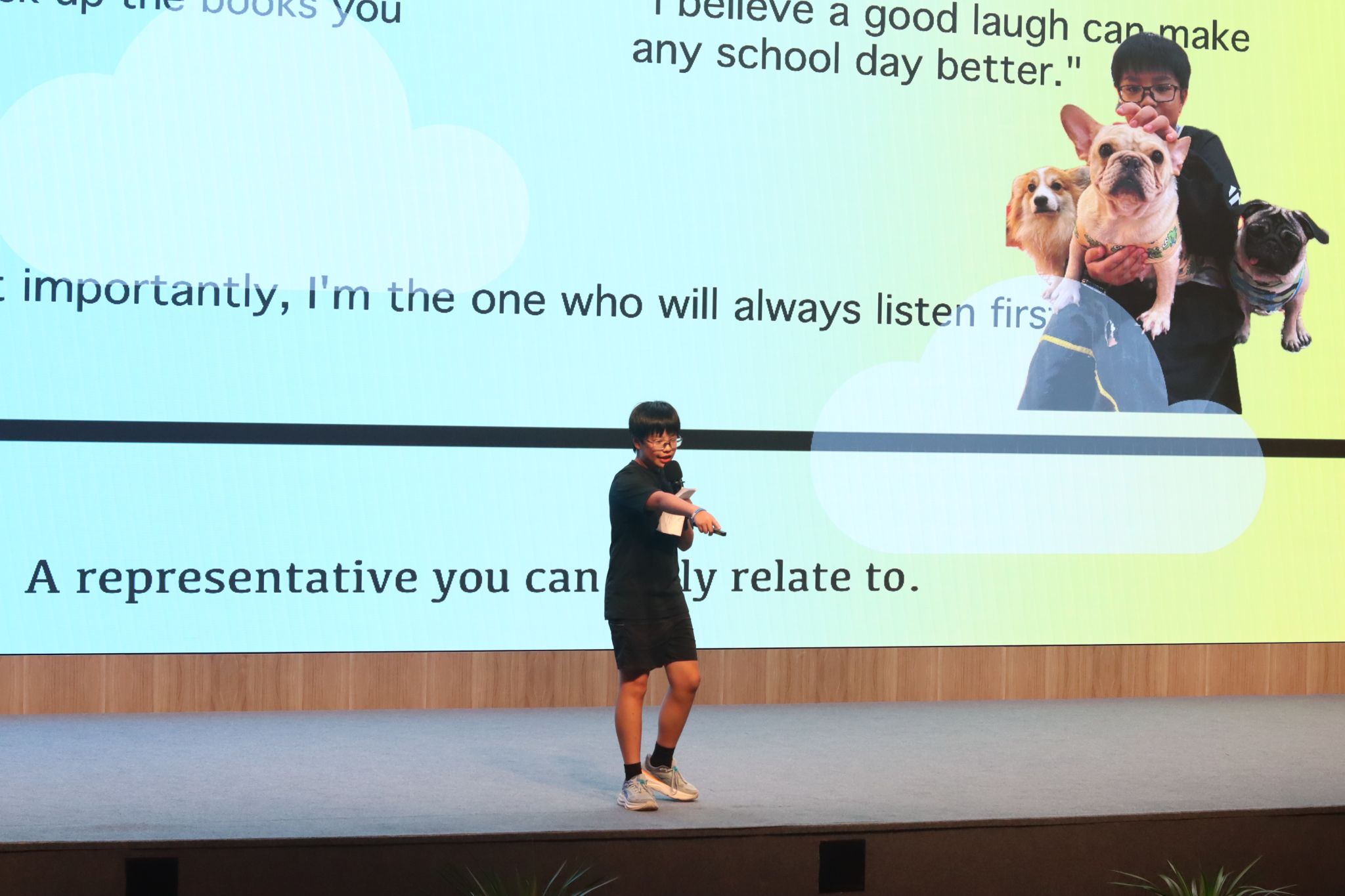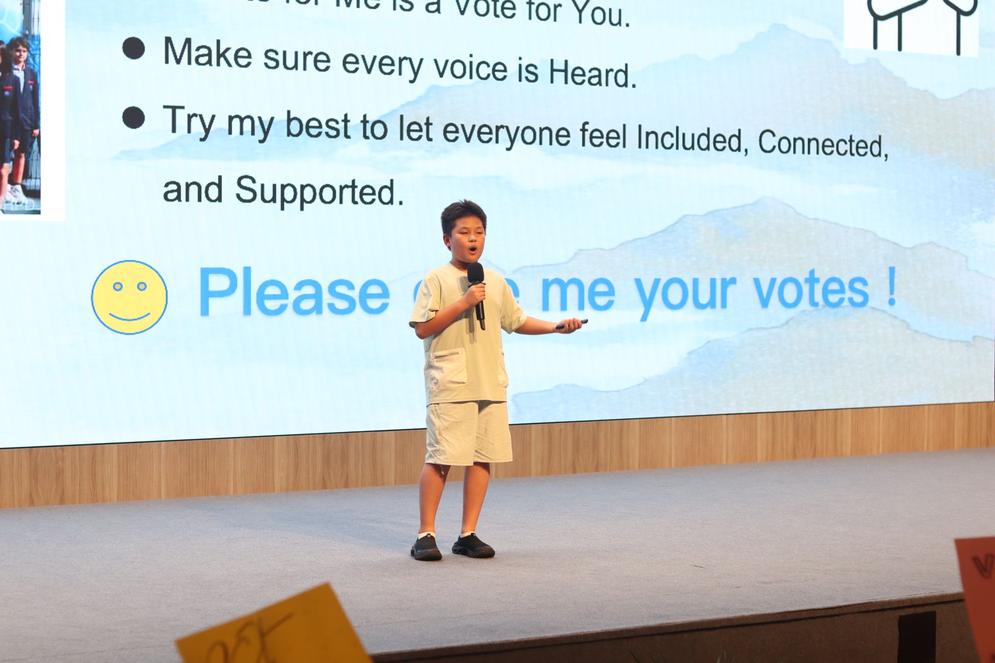 本届竞选者们来自不同班级,却有着共同的心声:希望为校园贡献力量。在他们的演讲中,我们听到了不止于承诺的行动计划:有的同学强调服务与沟通,提出“周三意见收集+周五反馈跟进”机制,力求实现真正有效的双向沟通;有的同学展现出创意与活力,呼吁“让校园成为笑声与联结的地方”;还有同学突出自己多元的经历与综合能力,提出组织“学习分享会”,倡导建立图书漂流系统,呼应了同学们对丰富校园生活的期待。