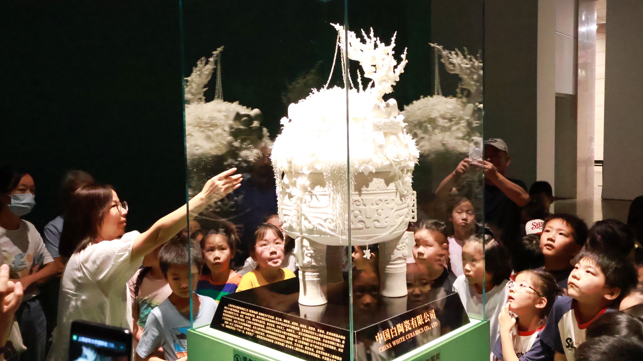 带着之前积累的专业知识,孩子们怀揣着好奇踏入了艺术宫。讲解老师倾囊相授,孩子则全神贯注,目光紧随、耳听心受,唯恐错过一分精彩。柔和的灯光如一层薄纱,轻轻洒落在展柜的白瓷之上。那温润的釉色在灯光下渐渐晕染开来,仿佛一幅静谧舒展的绝美画卷。