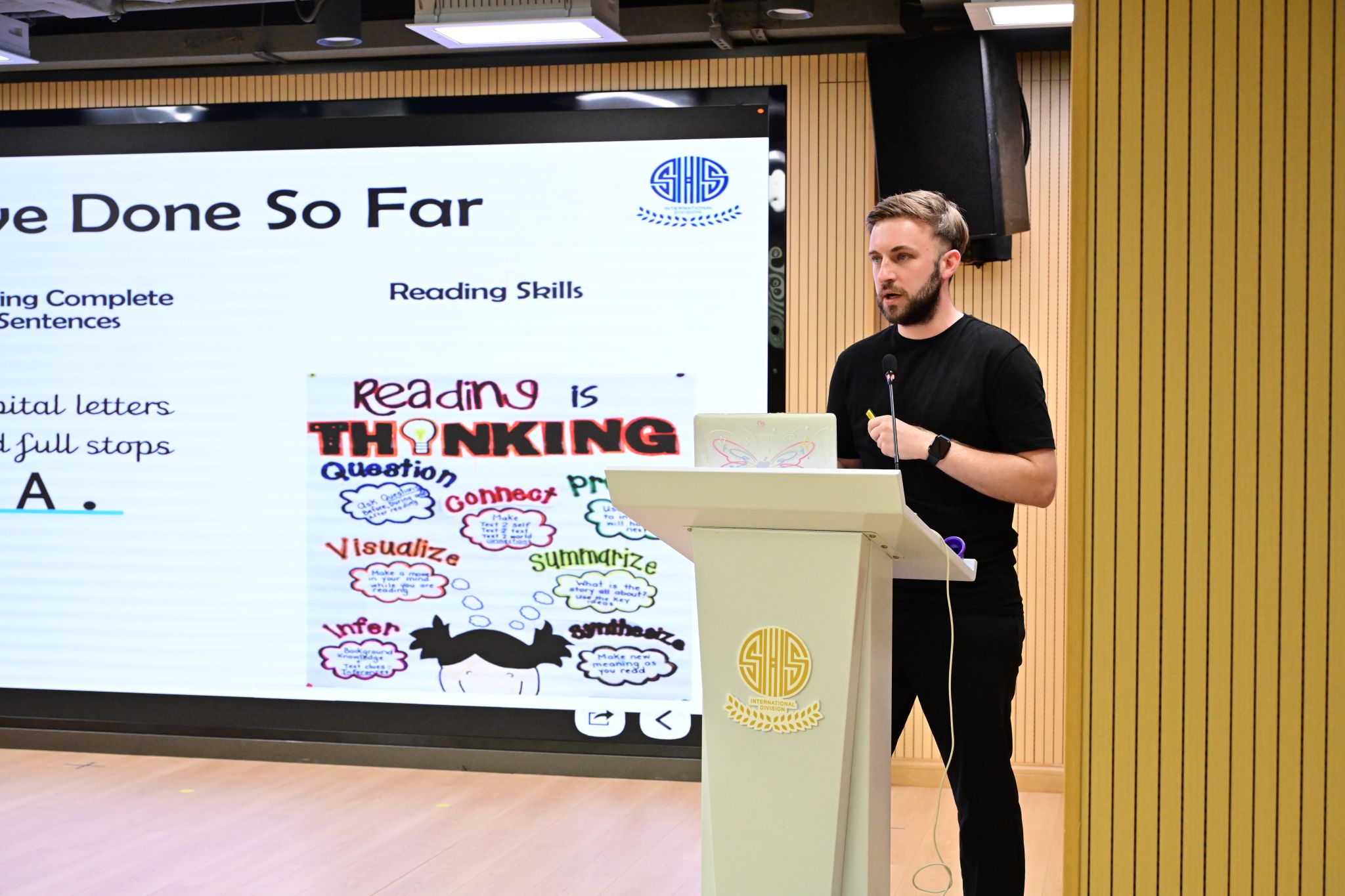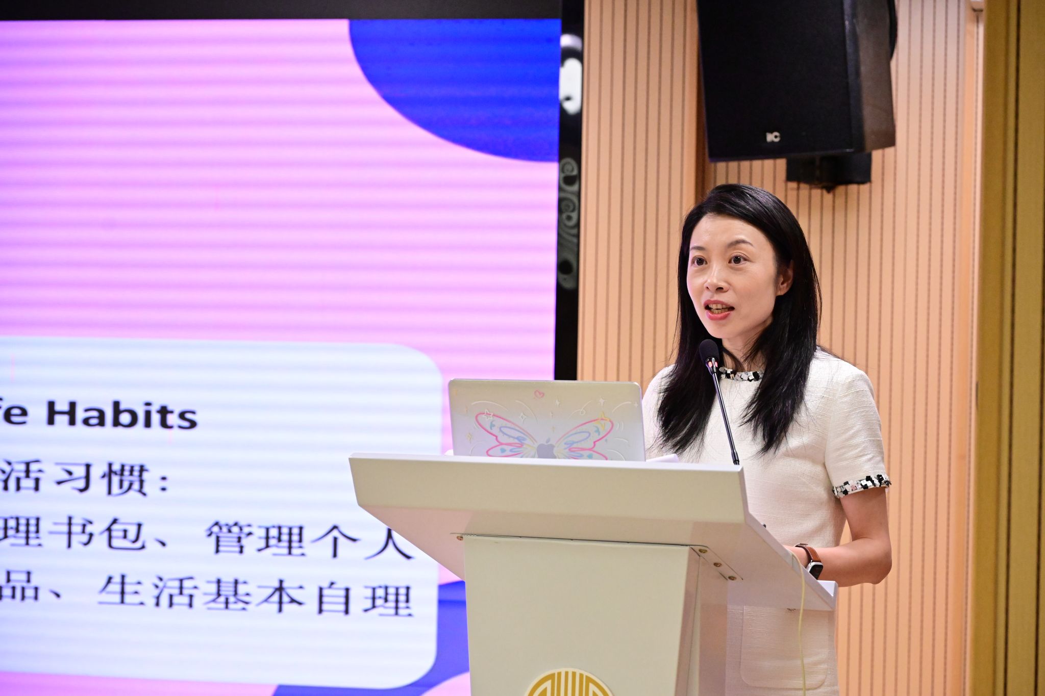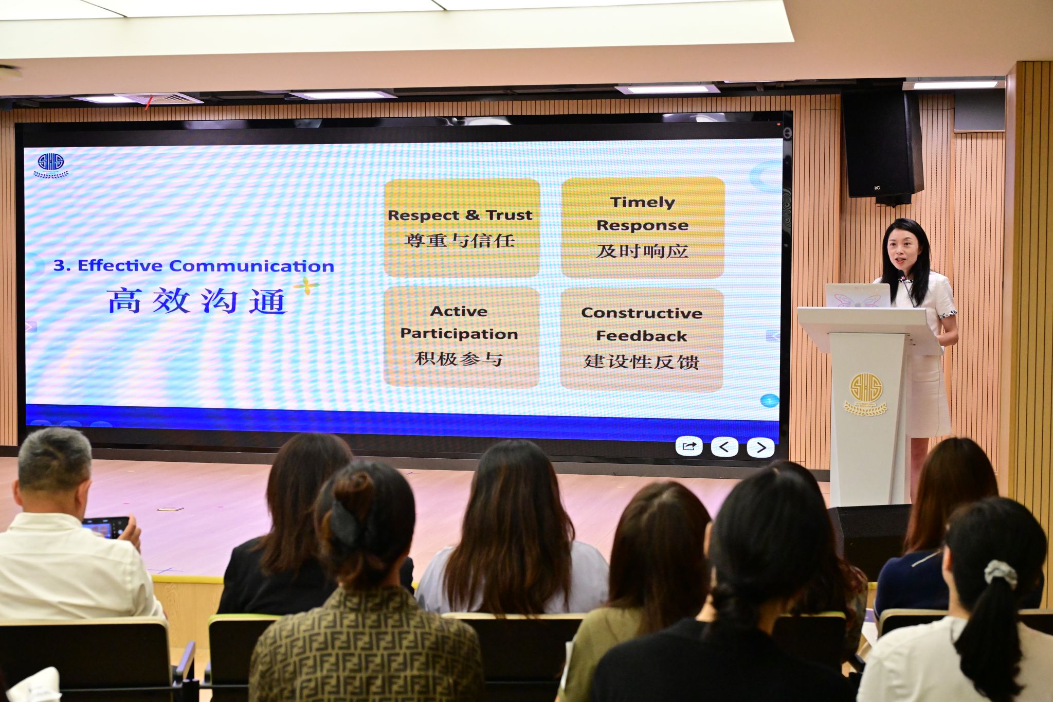 虹口校区负责人朱丹主任以“全人教育”理念为切入点,深入阐释了家校协同的深远意义。她指出,学校致力于培养学生成为“独立自主的学习者”和“负责任的世界公民”,并详细介绍了应对AI时代挑战所需的核心能力,包括学习力、批判性思维、创造力、沟通协作及道德责任感。朱丹主任强调,这些能力是孩子未来发展的基石。为实现这一目标,学校的课程设计融合了核心学术、兴趣发展与创新体验,并采用以学生为中心的教学方法,鼓励游戏化、体验式学习,同时融入品格培养。她进一步解释了学校的多元动态评价体系以及全面的学习支持系统,强调了班主任的关键作用和学习反馈机制。最后,朱丹主任着重呼吁家长们从“统一理念、习惯优先、高效沟通”三个关键词出发,与学校携手同行,共同为孩子的成长打下坚实基础,使其在未来的时代浪潮中,不仅能适应,更能创造未来。