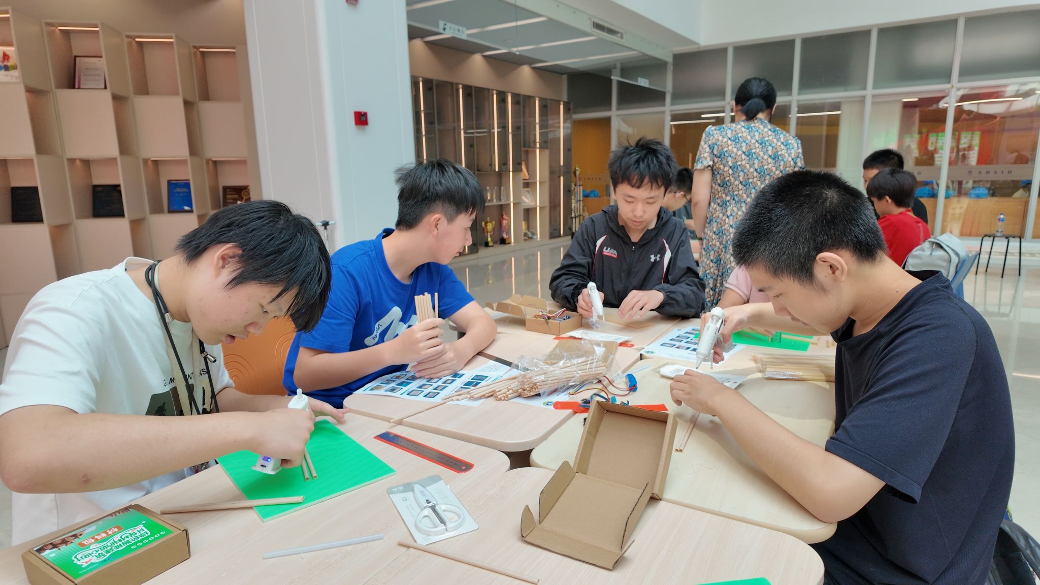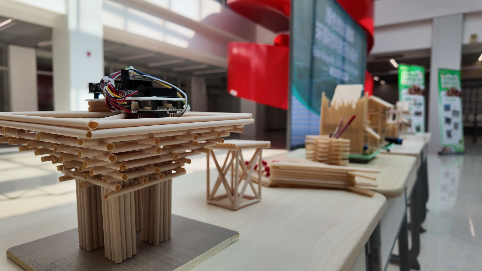 课堂内容分为理论学习与实践操作两个环节。学生首先学习了建筑结构的基本原理,随后围绕竹纤维材料,分组展开创意建筑模型的设计与搭建。从草图构思、结构优化到模型组装,同学们全程协作,将创意逐步转化为实体作品。课堂成果丰富多样:有的作品精巧复现了桥梁结构,有的重现了中华艺术宫的独特造型,还有小组构思出兼具趣味性与功能性的“坦克”模型。