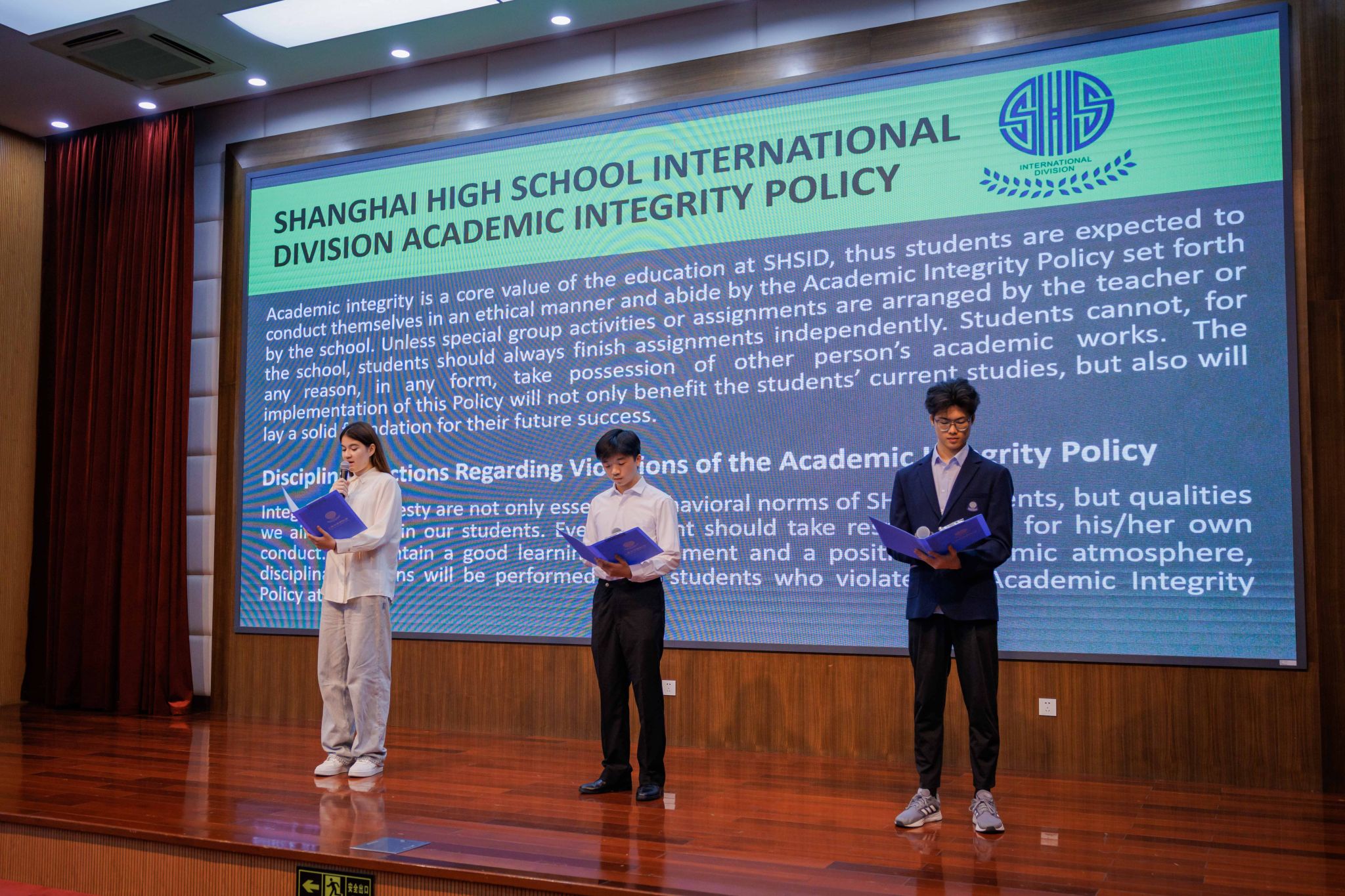 2025年9月26日早晨,上海中学国际部十二年级全体学生齐聚先棉堂辅楼礼堂。此次晨会由虞贞老师主持,举行了2026 届学生诚信宣誓仪式。仪式详细介绍《学术诚信政策》、《ED政策》以及《申请诚信声明》,全体学生在学生代表的带领下作出宣誓。国际部高中马峰校长、张丽副校长、刘琴主任、蒋皓老师及升学指导办公室的指导老师们参加了仪式。