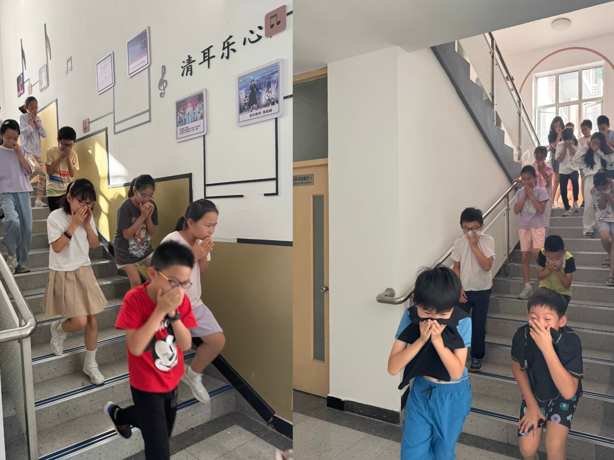 随着警报声骤然响起,教学楼内立即进入应急状态。各班主任沉着冷静,迅速组织学生撤离。一至三年级学生从一楼就近出口疏散,四至五年级则按照指定路线从二楼有序撤离。整个过程中,学生们严格遵循演练规范,低头弯腰,捂住口鼻,快速前进;走廊和楼梯口的教师则全程守位,指挥疏导,避免出现拥堵与混乱。演练现场紧张而有序,真正做到了“快而不乱,稳而不散”。