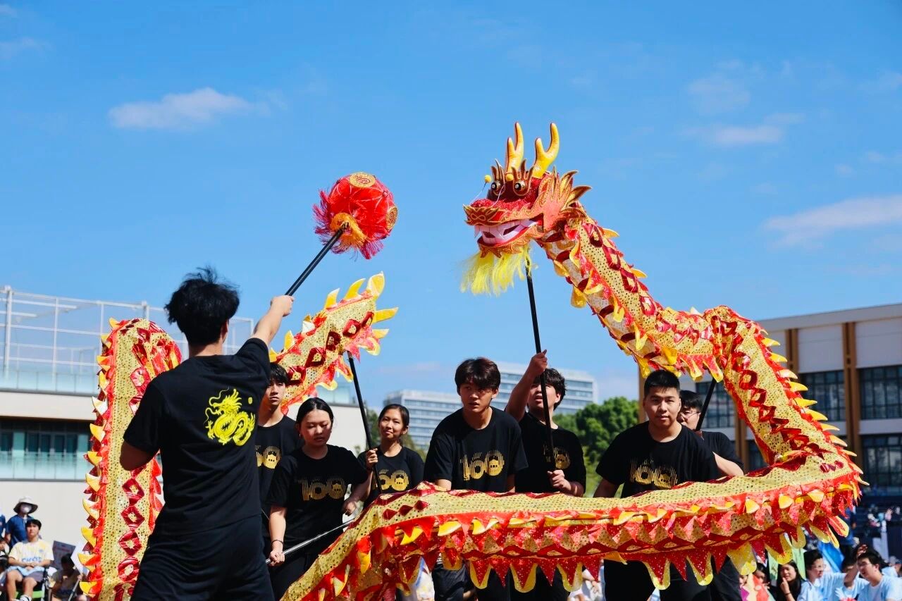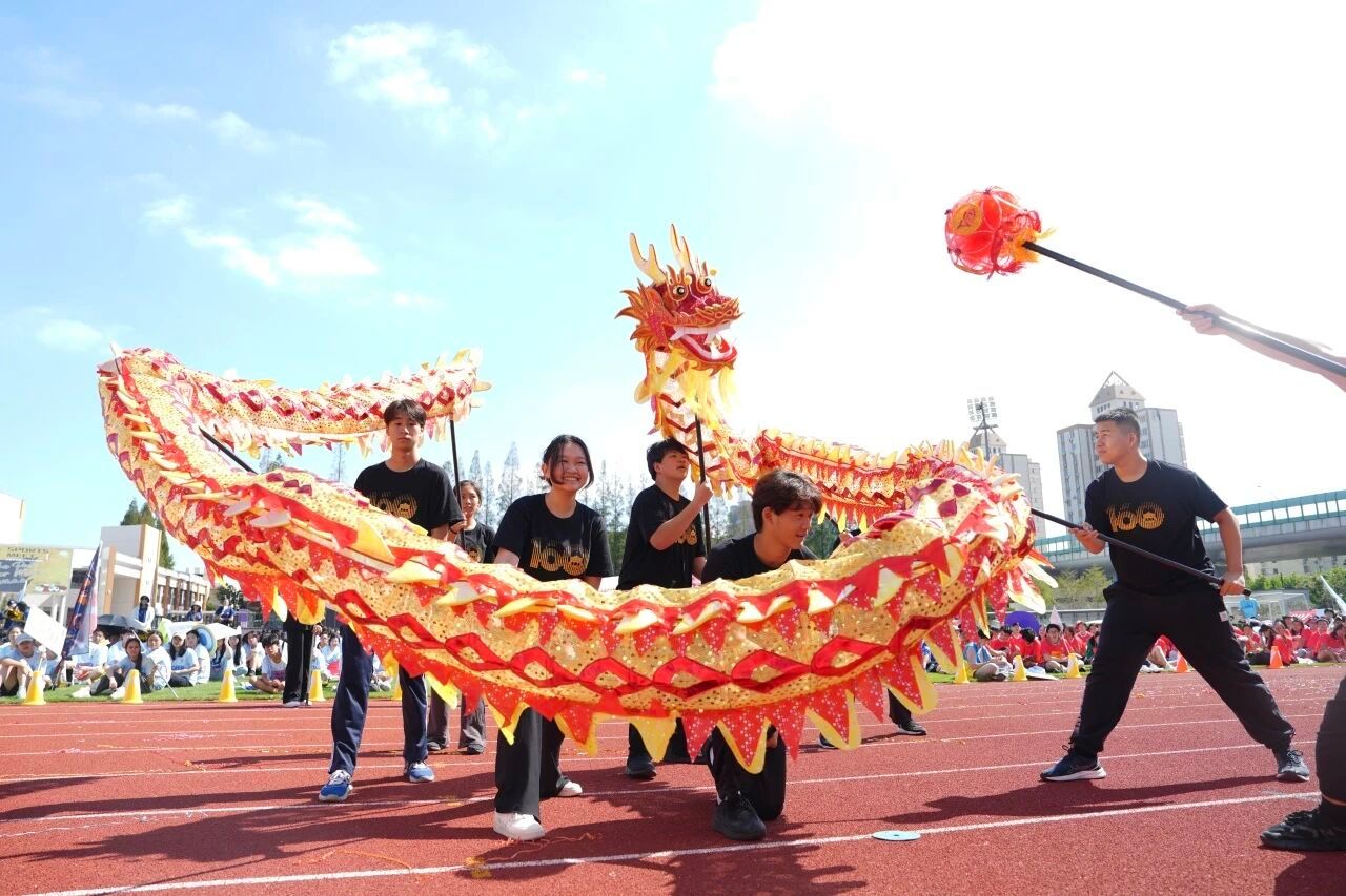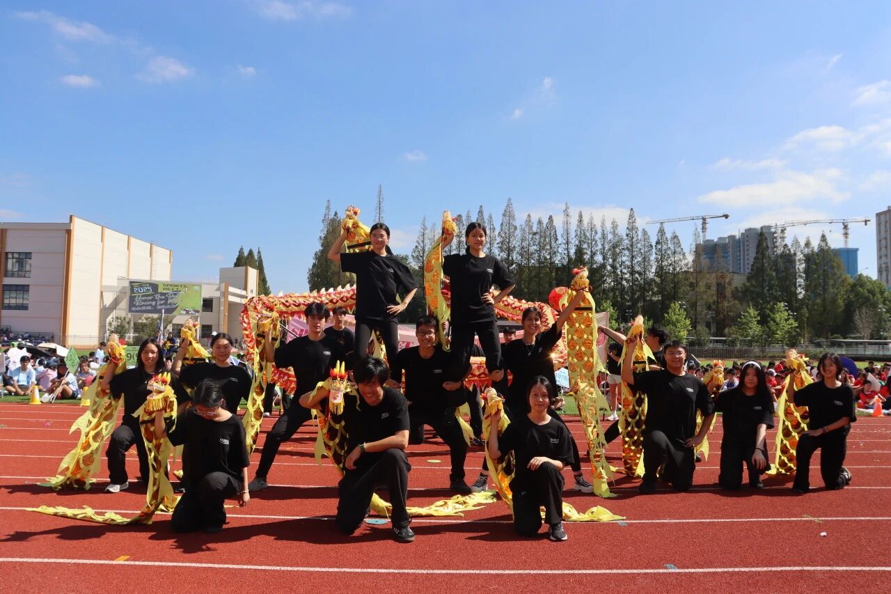 10年级PBL舞龙课程的同学们与ASB合作呈现的舞龙表演率先出场。金龙腾跃,鼓点铿锵,长龙翻腾盘旋于跑道之上,气势如虹。舞者步伐稳健、配合默契,尽显力量与节奏之美。随着龙身穿梭摆动,现场气氛在瞬间被点燃,观众席爆发出阵阵欢呼。