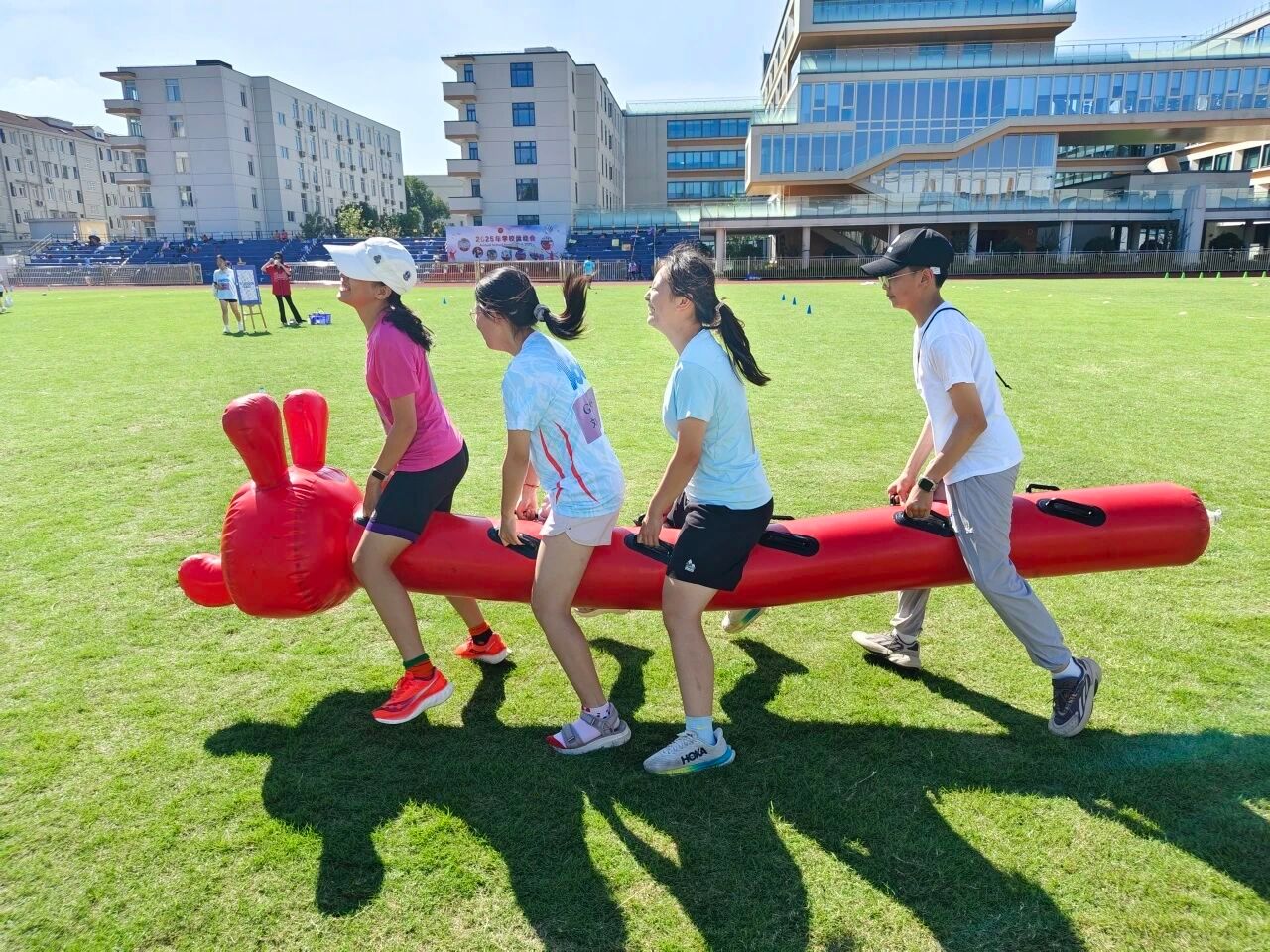 午后,赛场上的加油声转化为欢笑声,趣味运动嘉年华热闹登场。“两人三足”中,同学们步伐摇晃却笑声不断,共同携手冲线;“风火轮”项目则考验团队默契,多位队员合力推动彩带前行,引来阵阵叫好。除了团队合作,个人挑战同样精彩——弯腰过杆、套圈、掰手腕等游戏让观众惊呼连连,激光射击与滑冰体验区也是人潮不断。此刻,操场上洋溢着的,不是输赢之争,而是友谊与欢愉。赛场上是对手,场下是伙伴;体育磨砺的不只是体力,更是品格。