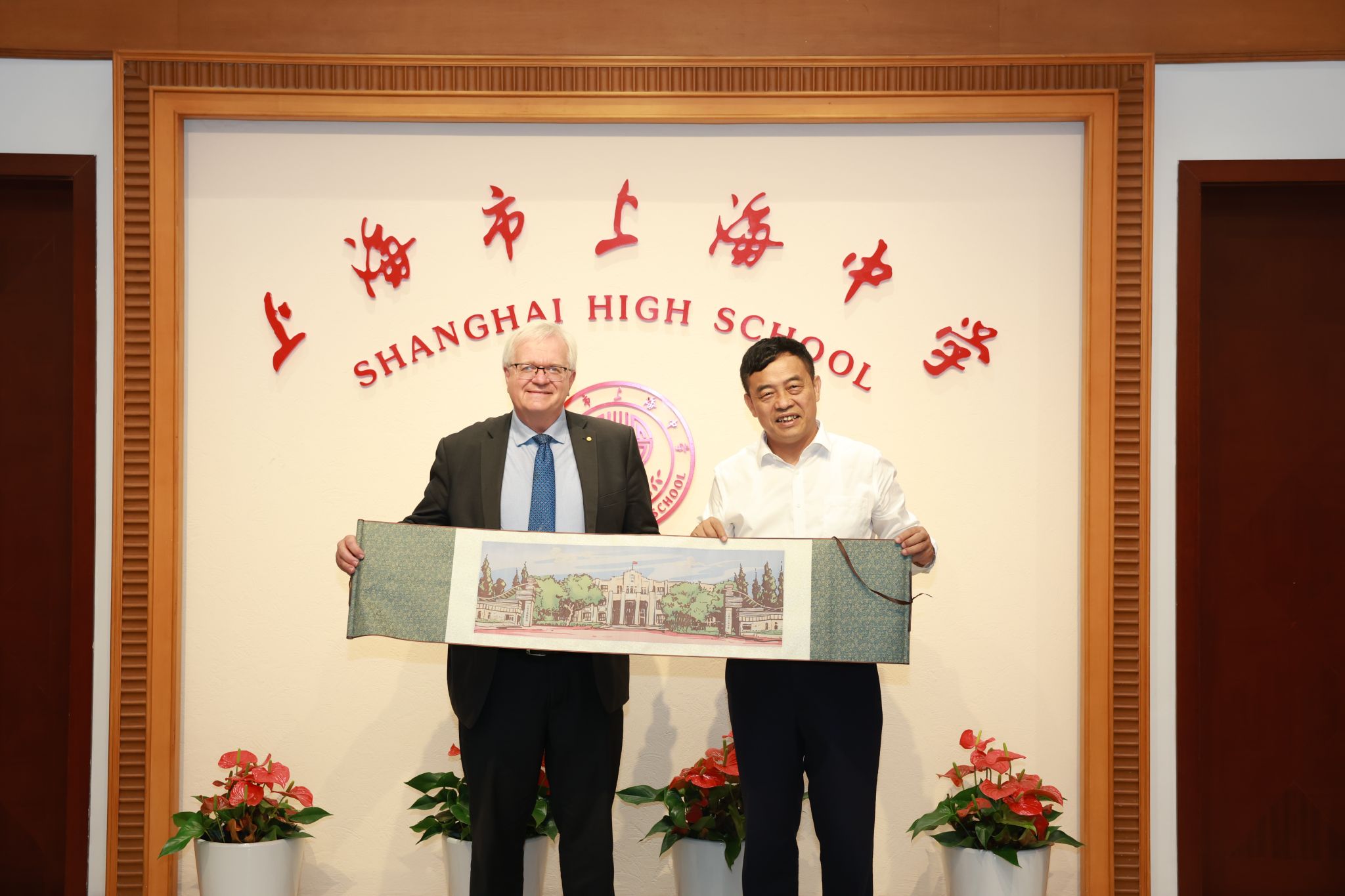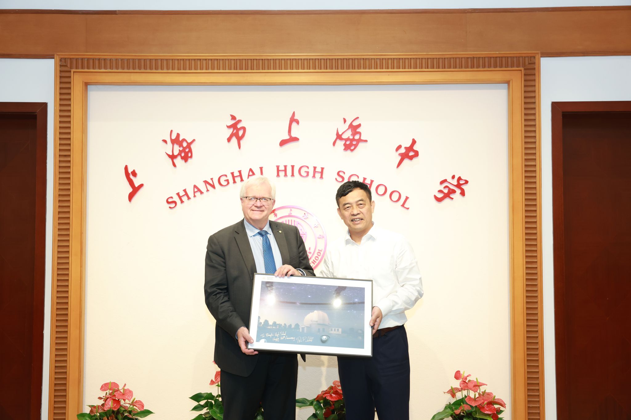 上海中学校长冯志刚、党委副书记樊新强等校领导热情接待施密特教授一行,双方互赠纪念品。施密特教授特别献上了澳大利亚国立大学天文台纪念品,并亲自题词,以庆祝上海中学建校160周年。