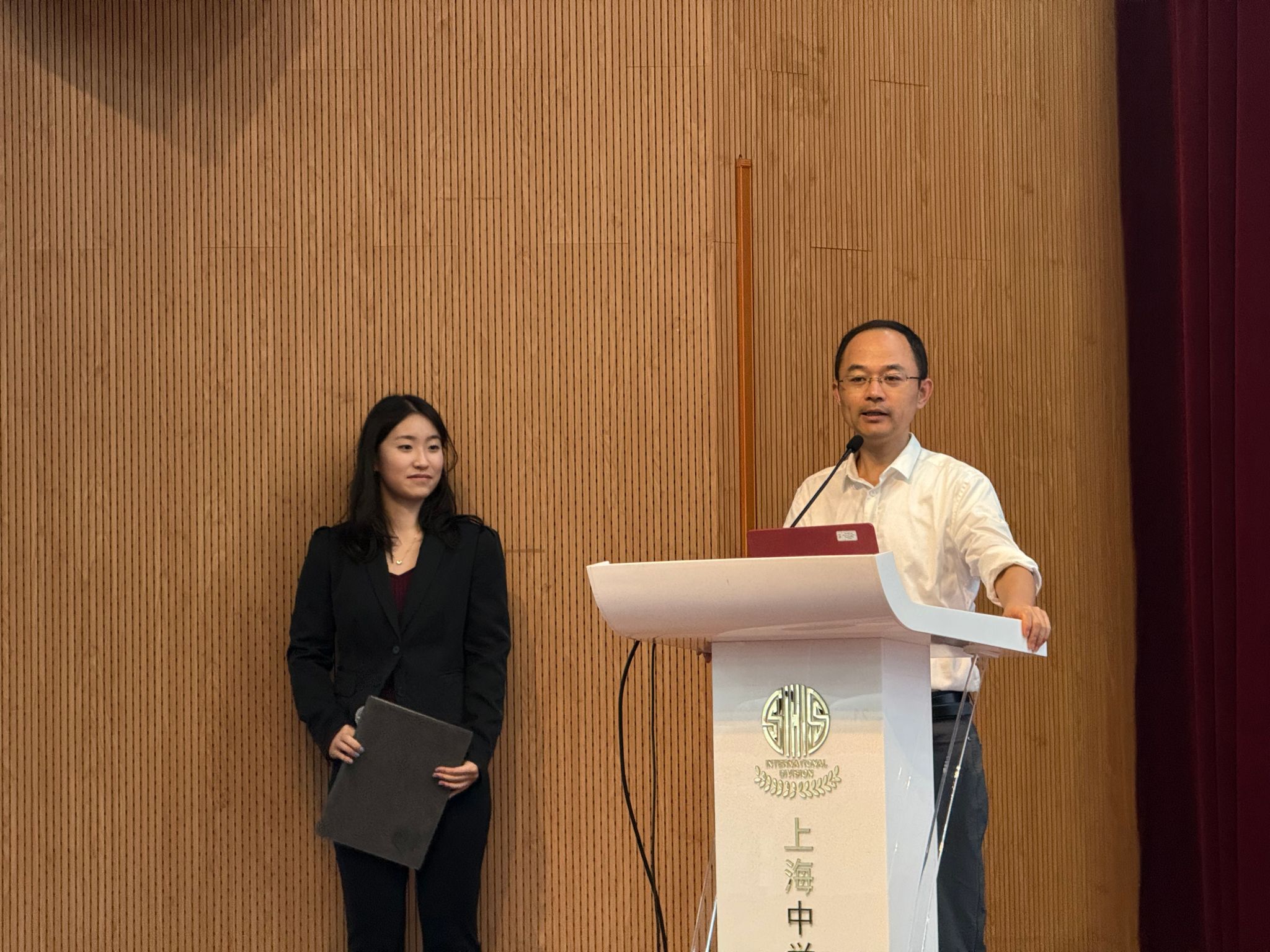 随后,高中段校长马峰老师发表讲话。他以“AI时代的人文精神”为主题,鼓励同学们在数字化的浪潮中,依然保持“面对面”的温度,通过线下志愿活动与社会服务,培养真正的共情力与领导力。接着,NHS指导老师刘琴老师介绍了本学期的主要项目规划,以及各成员的责任分工,鼓励新成员积极参与未来的服务与领导活动。