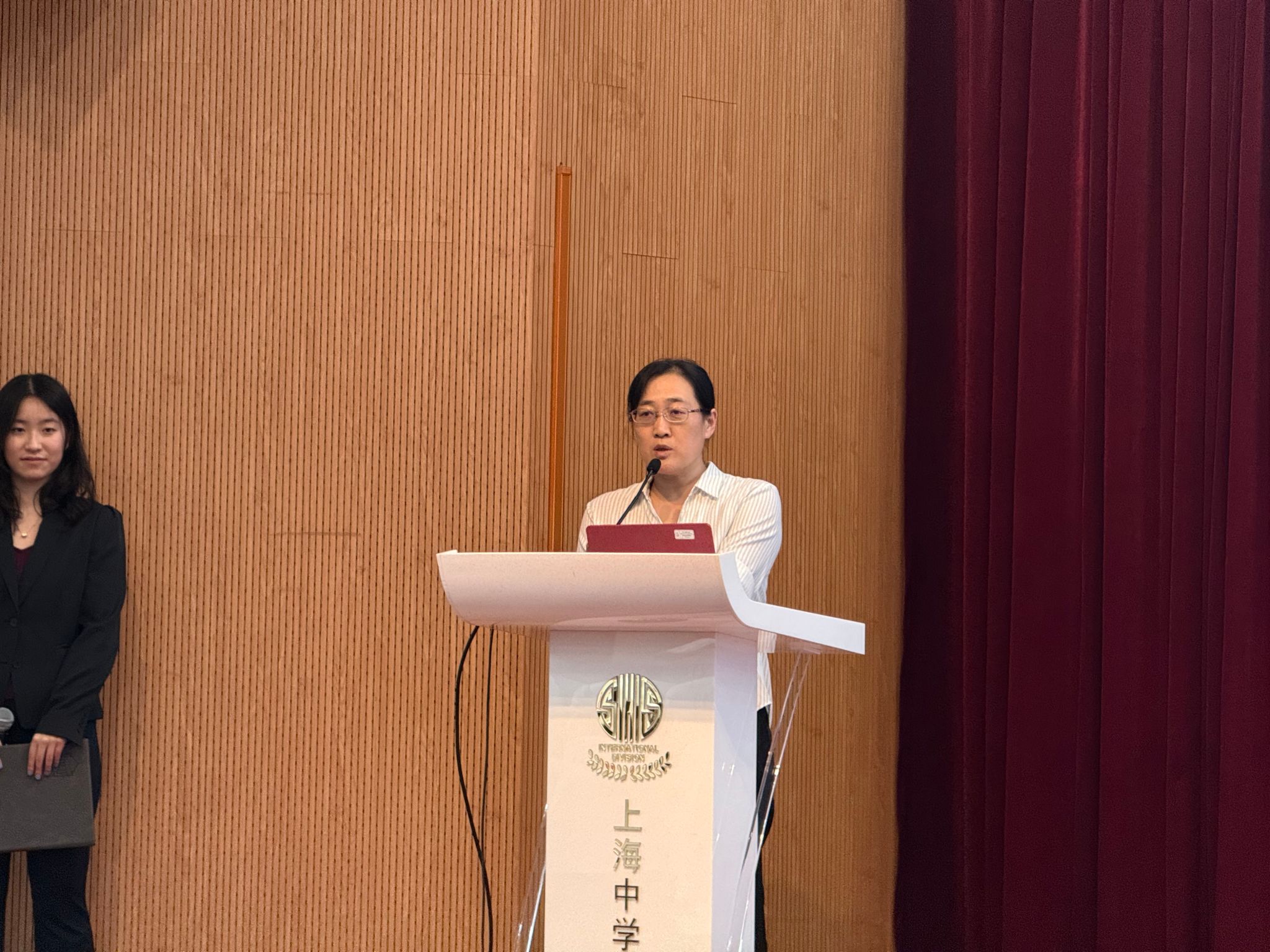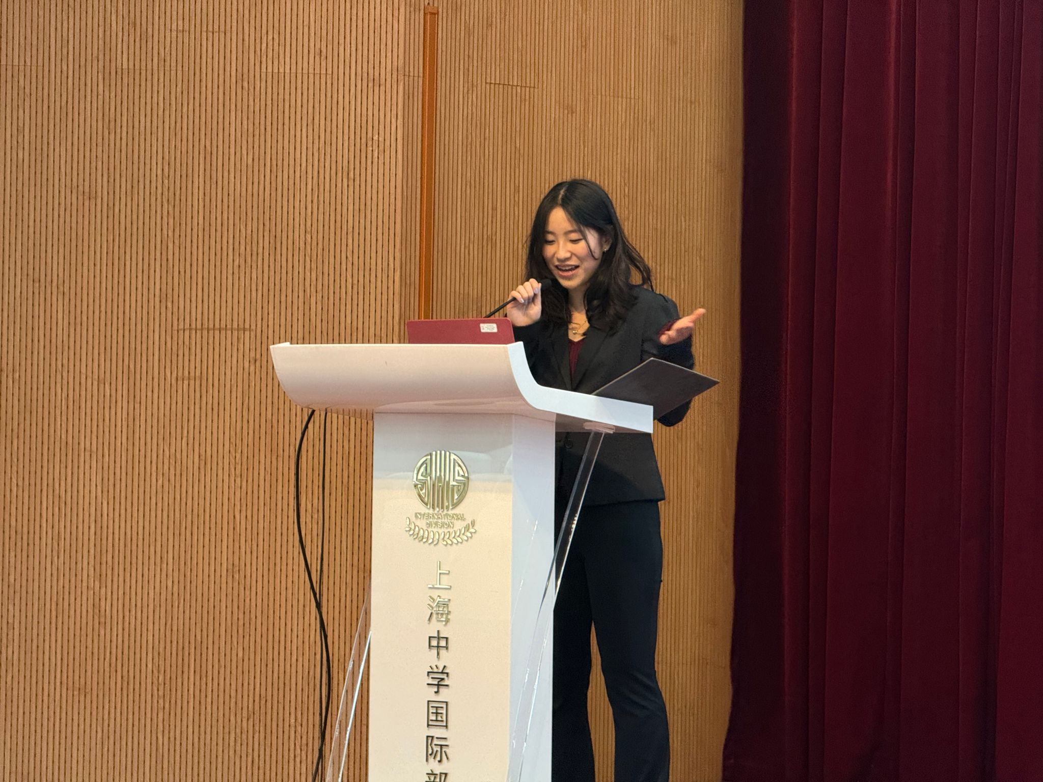典礼伊始,NHS主席12(1)的Sophia Fang发表了开场致辞。她回顾了NHS自2019年成立以来的历程,介绍了社团在学术支持与社区服务方面的项目成果,包括“Friday Movie Night”、“Stress Down Day”、与河南省申国完小学的远程支教合作、以及由她与2025–2026届领导团队共同带领的最新项目——“家乡的故事”双语故事分享活动。她强调,NHS的精神不仅在于学术的卓越,更在于服务与责任的延伸。