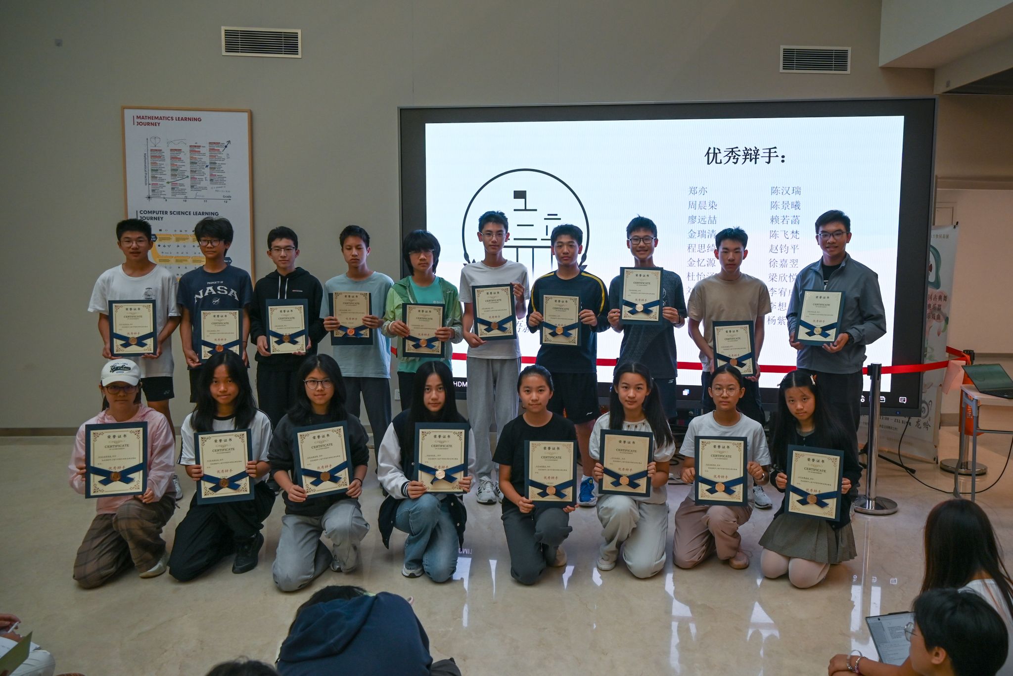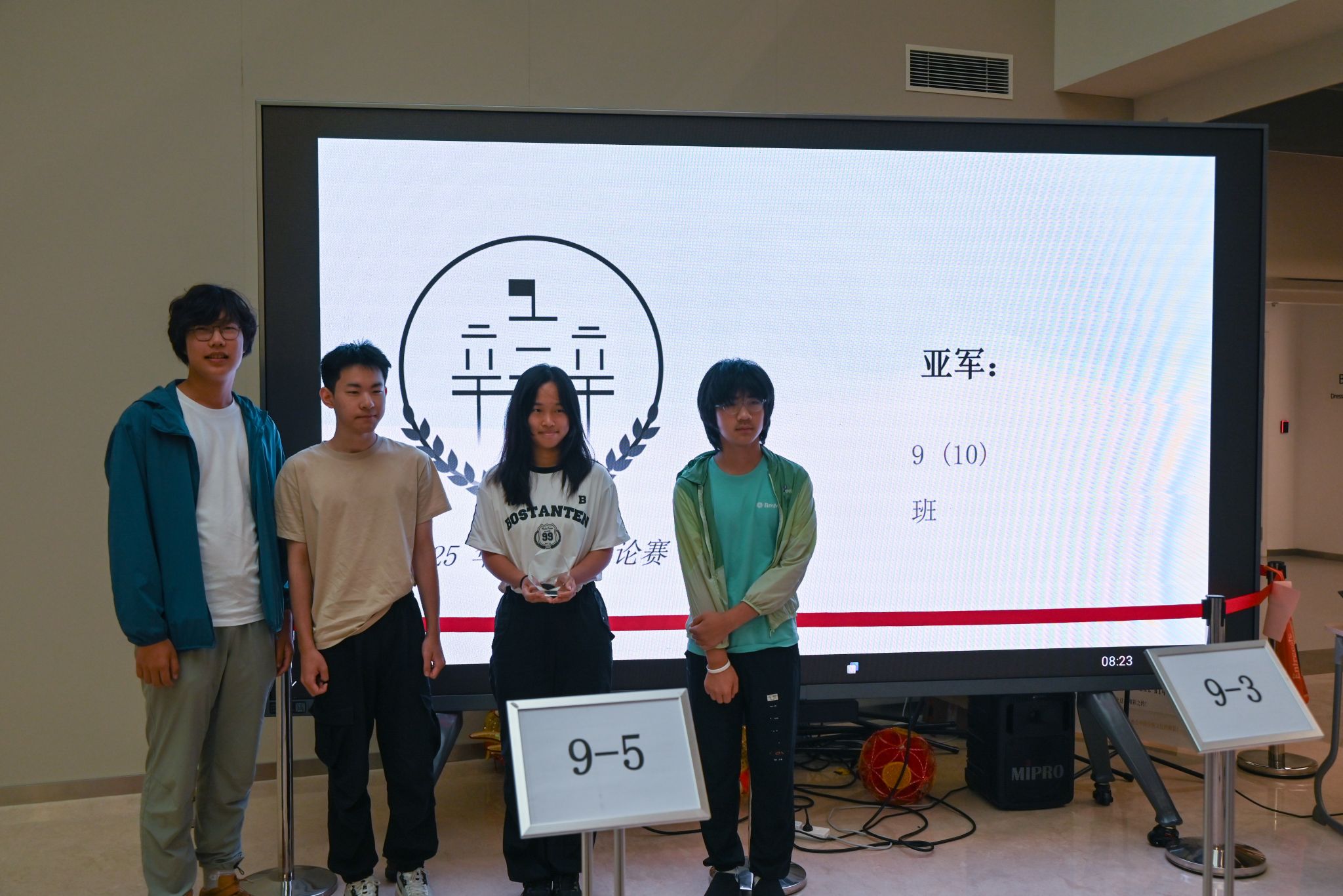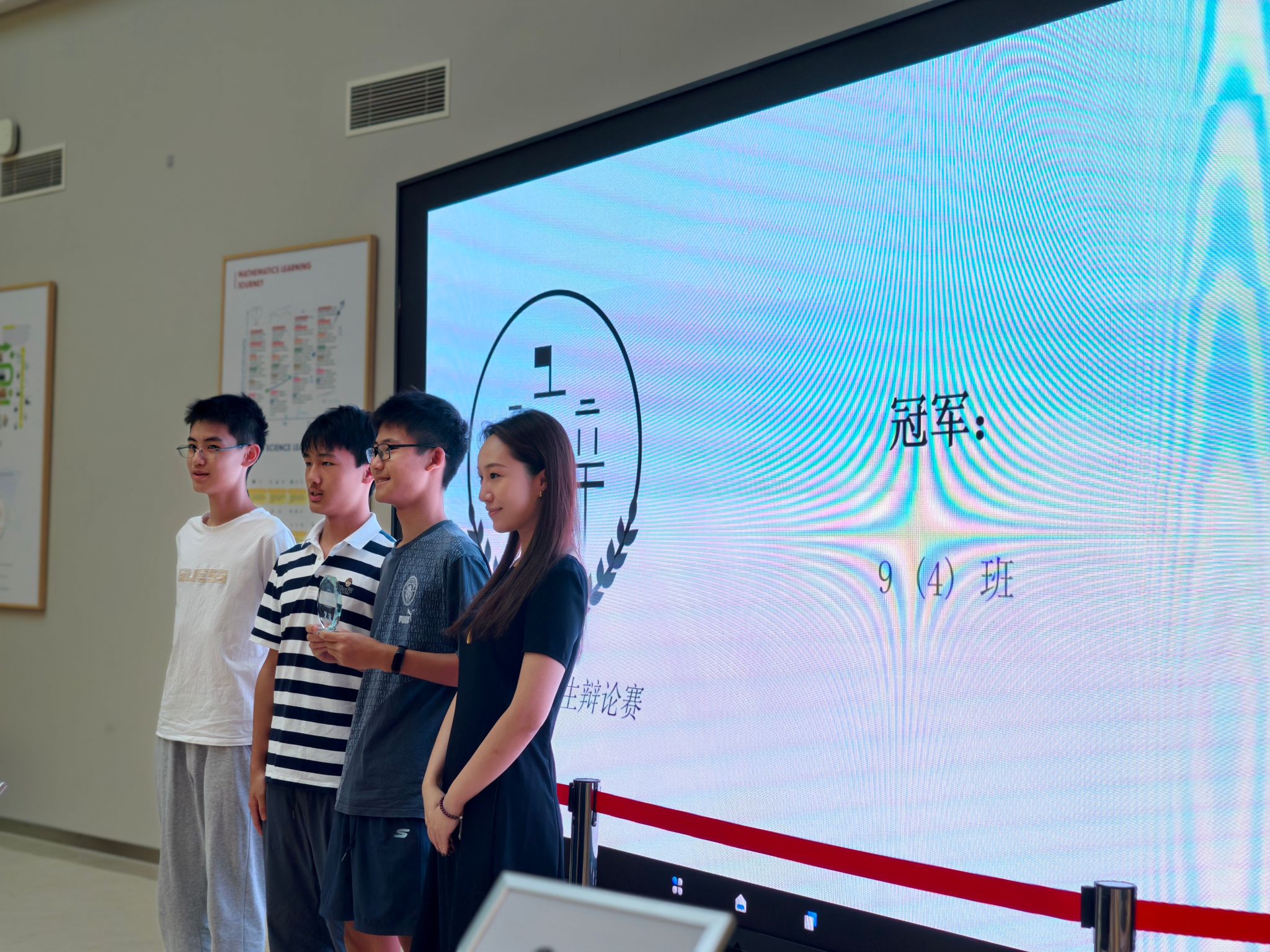 在热烈的掌声中,颁奖环节正式开始。9(1)班的卢同学凭借出色表现,荣获“最佳辩手”称号。团队奖项方面,9(4)班摘得冠军,9(10)班荣获亚军,9(1)班与9(6)班并列季军。此外,多位同学因表现突出获得“优秀辩手”称号,并依次上台领奖,现场掌声此起彼伏。