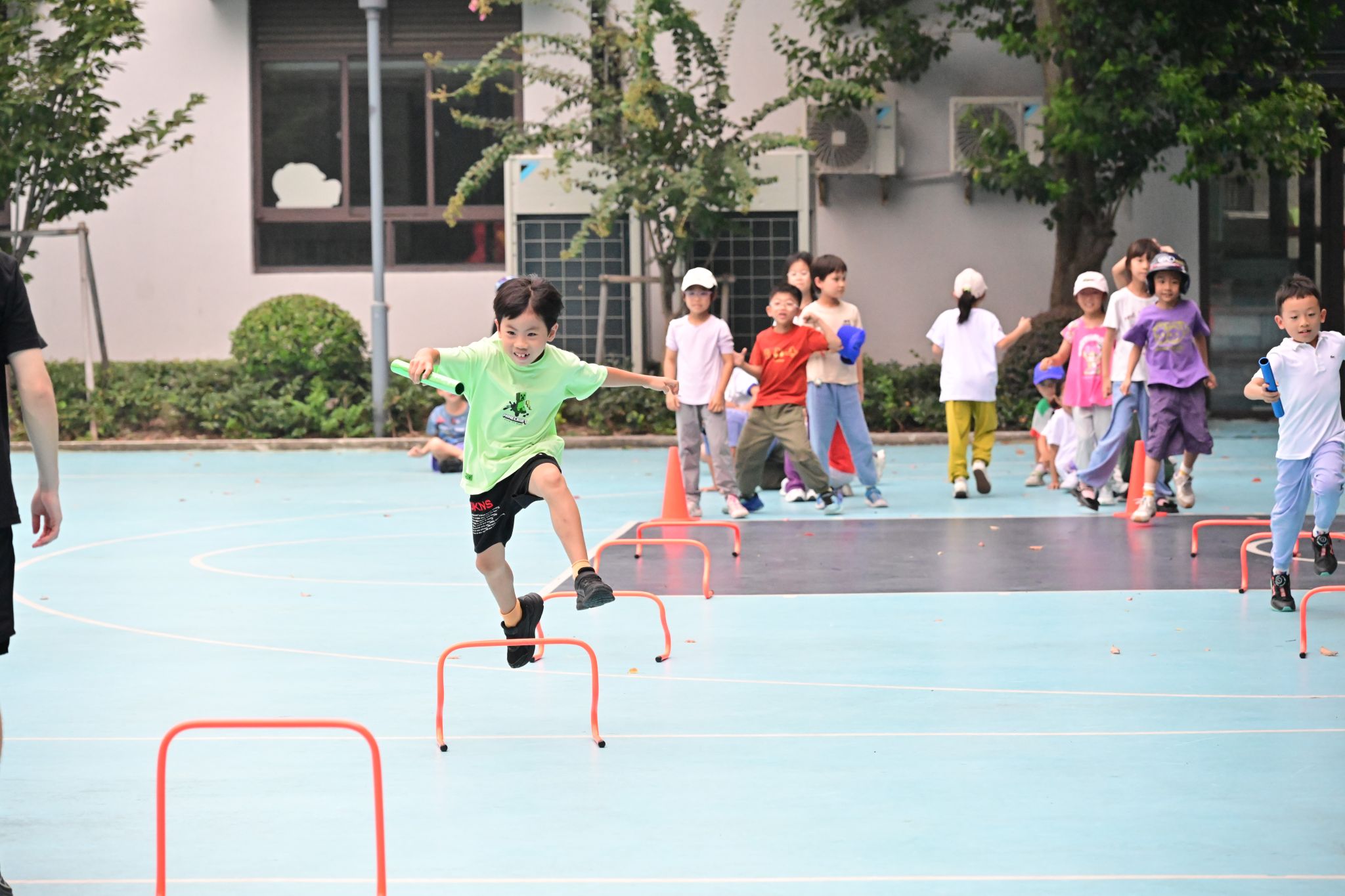 操场上的“障碍接力跑”最为激烈,小朋友们需要连续翻越六层障碍:先爬过软垫“小山”,再钻过彩色隧道。当小队员在跃过障碍物时不小心脱落了鞋子,他没有丝毫慌乱,而是迅速捡起鞋子穿好,立即继续投入比赛,一旁的小伙伴们也纷纷为他呐喊助威。当最后一棒冲过终点时,整个队伍瞬间爆发出热烈的欢呼与掌声,共同分享着成功的巨大喜悦。
