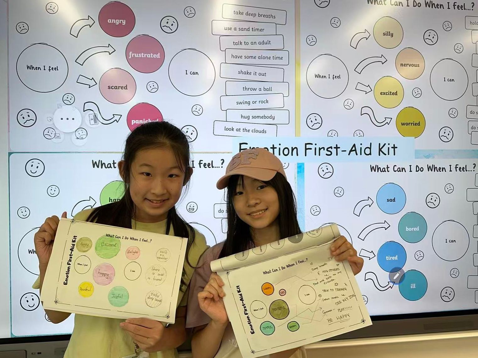 为进一步了解大家五年级的新生活体验,课堂上还开展了绘制“情绪天气图”的活动。老师提供了太阳、雨滴等代表不同情绪的天气符号,让同学们在方框中绘制符合自己五年级第一周感受的符号,并分享背后的故事。不少同学坦诚分享了自己的困惑、紧张和焦虑。针对这些真实的情绪表达,老师引导大家树立“直面情绪,不回避”的理念,并组织大家讨论情绪处理的方法,最终共同制作了“情绪急救包”。在“情绪急救包”中,同学们结合方法与经验,为不同情绪对症下药。老师还特别提醒大家,如果尝试多种方法后仍无法缓解情绪,一定要及时向父母或老师求助。