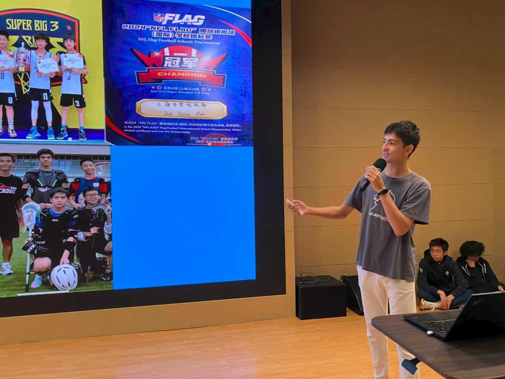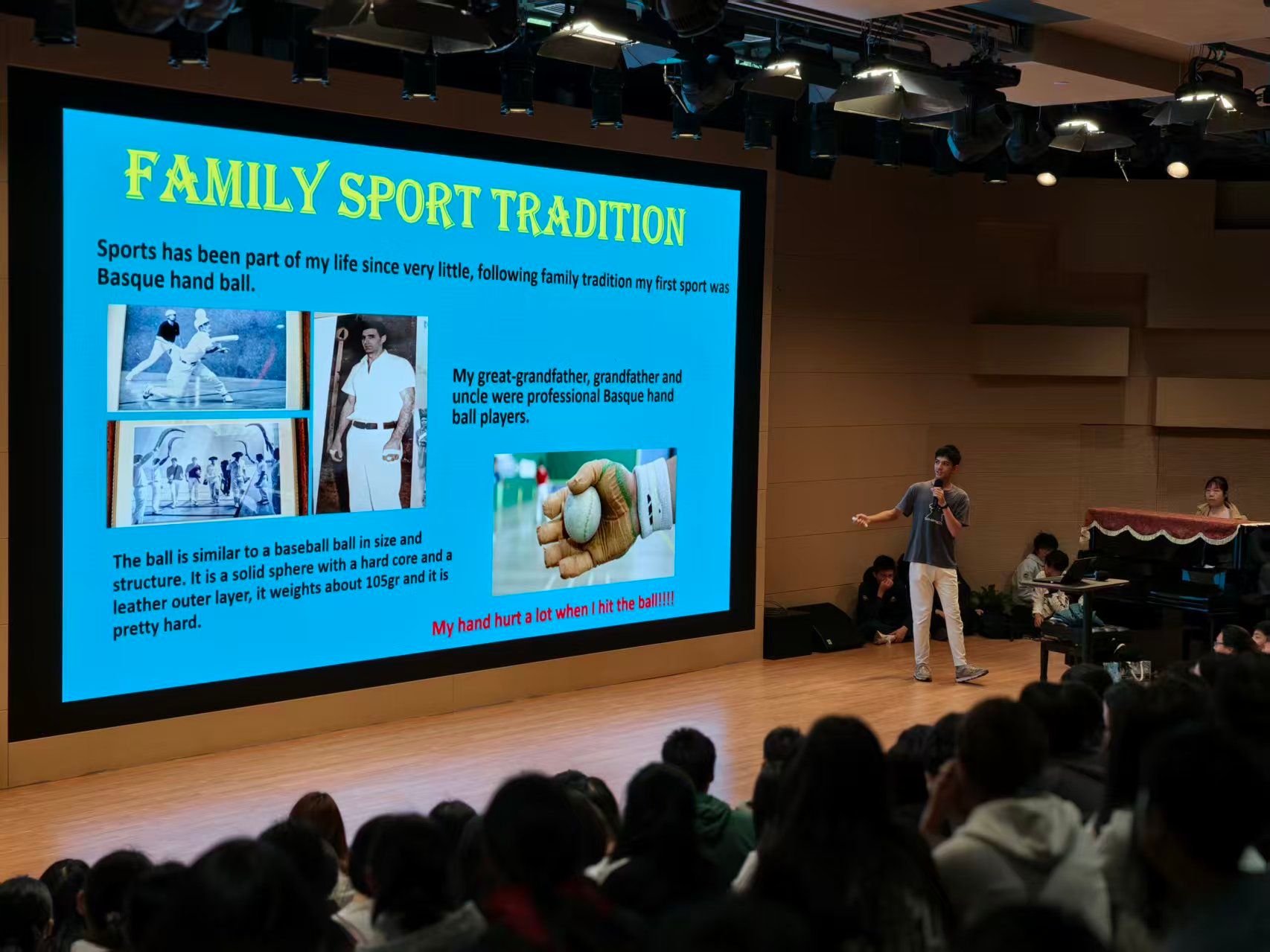 沈同学从家乡的传统运动——西班牙手球引入主题。他介绍道,手球是一项充满活力与激情的团队运动,讲究速度、力量和团队配合。沈同学还结合自身的运动经历,鼓励同学们养成规律锻炼的习惯。他强调,体育运动不仅能增强体魄,更能滋养心灵。规律的运动能强化肌肉、骨骼和心脏功能,同时缓解压力与焦虑。运动帮助学生在学习与休息间找到平衡,提升注意力、记忆力和解决问题的能力,使学习更加高效。与此同时,体育活动还能培养团队协作、纪律意识与领导能力,这些品质对未来的学习与生活都至关重要。