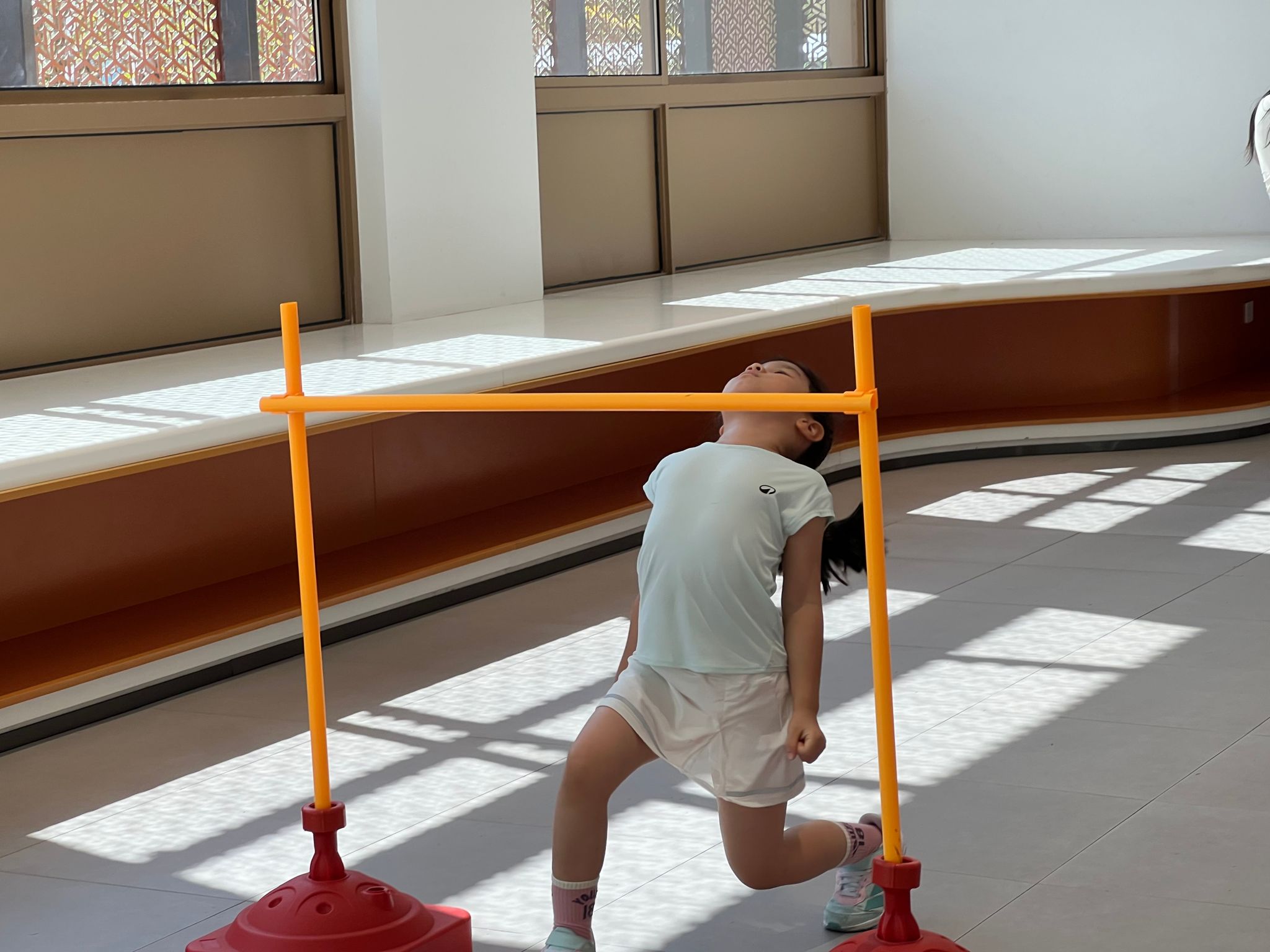 运动周的体育课与午休时间,也藏着别样乐趣。“下腰过杆”游戏前总是围满期待的身影,随着横杆一次次调低,孩子们屏住呼吸,小心翼翼地弓起腰背、仰起小脸尝试穿过。而“赶小猪”的游戏更是热闹,只见小朋友们手握标志桶,追着滚动的小球灵活奔跑。孩子们在轻松的氛围中享受着运动的快乐,笑容格外灿烂。