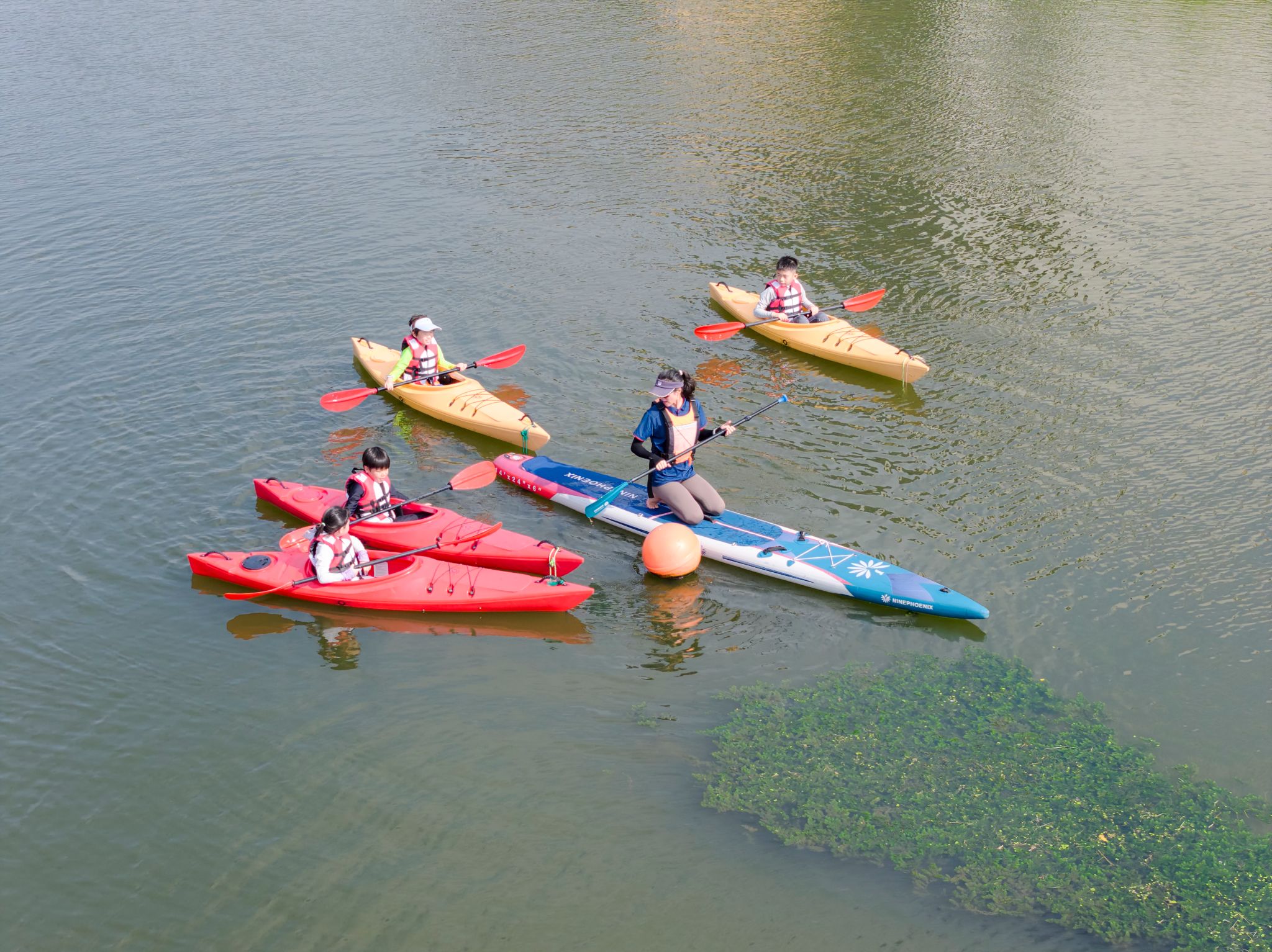 集体项目同样精彩,趣味接力赛上,孩子们边跑边传递接力球,小小的球承载着班级荣誉,20次传递满是协作的胜利;水面皮划艇接力别具一格,每班 5 位同学依次划行 200 米,桨叶轻碰完成交接,岸边的加油声都盖过了水声。