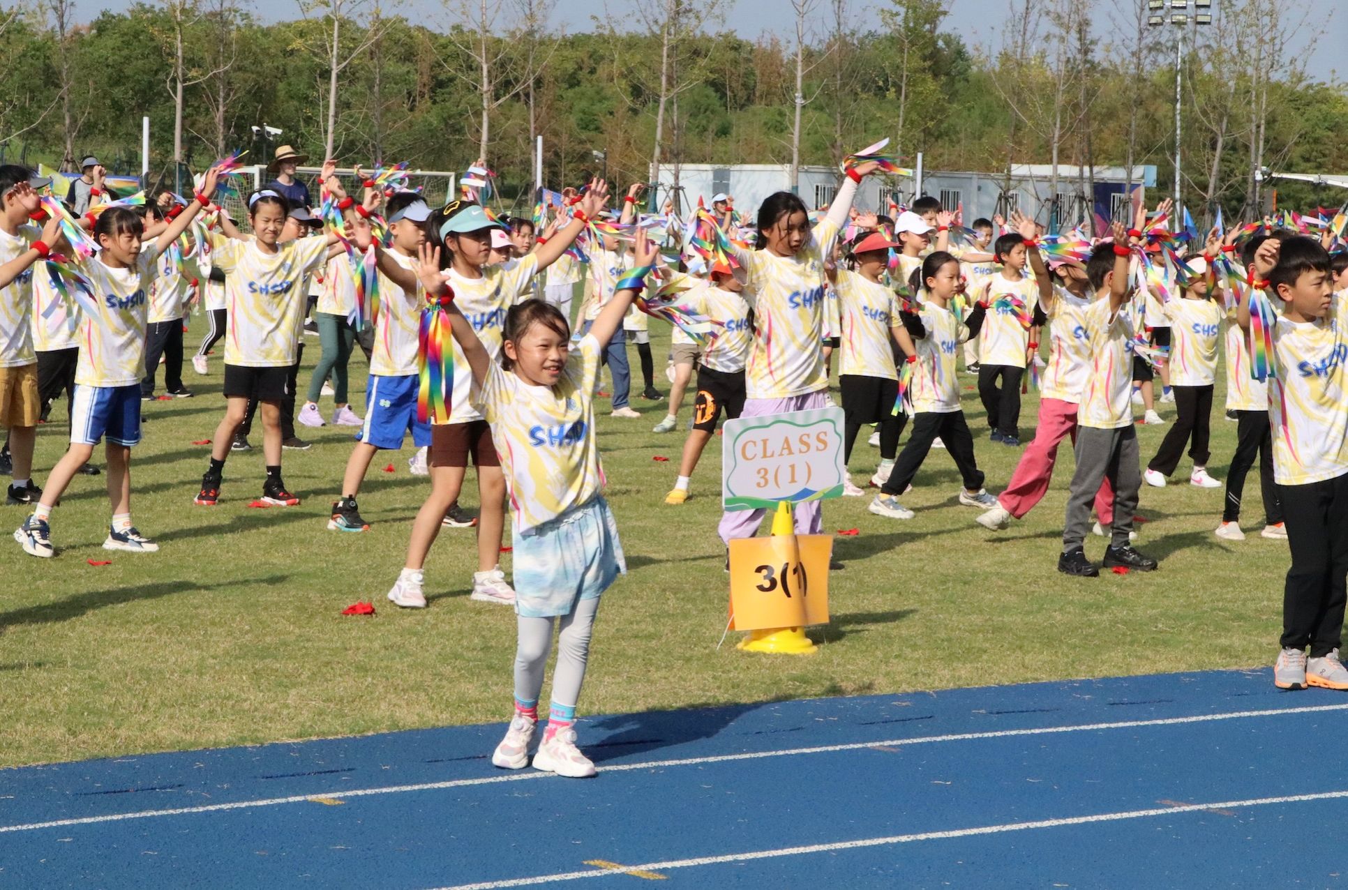 10月13 日,阳光格外明媚。上午 8 点半,伴随着音乐,各班队伍迈着整齐步伐依次进场,家长们坐在观众席上满是期待,运动会大幕正式拉开。来自 3-1 班的运动员代表 Katherine 分享了学习皮划艇的经历,她讲述自己起初划得慢、想放弃,后来才懂得成功需要正确方法和永不放弃的决心,并鼓励大家全力以赴。紧接着,学生团体操惊艳登场,孩子们挥舞手臂,手环彩带在空中飘荡,灵动身影引得家长纷纷记录;2-1 班 Mu 和 2-2 班 Daniel 的武术表演刚劲有力,尽显少年风采,传递着“少年强则国强”的精神。紧接着,老师们一首《The Champion》点燃全场,响起了阵阵掌声。最后,上海中学东校校长徐岳灿老师致开幕词,鼓励学生勇于挑战,为比赛注入满满能量。