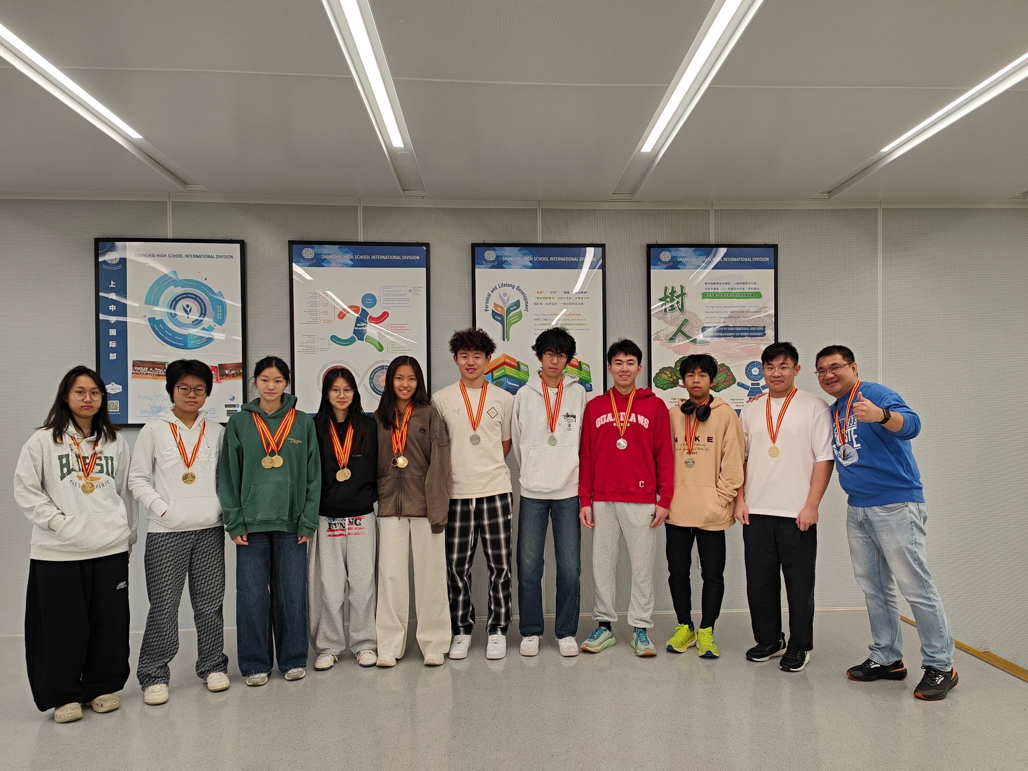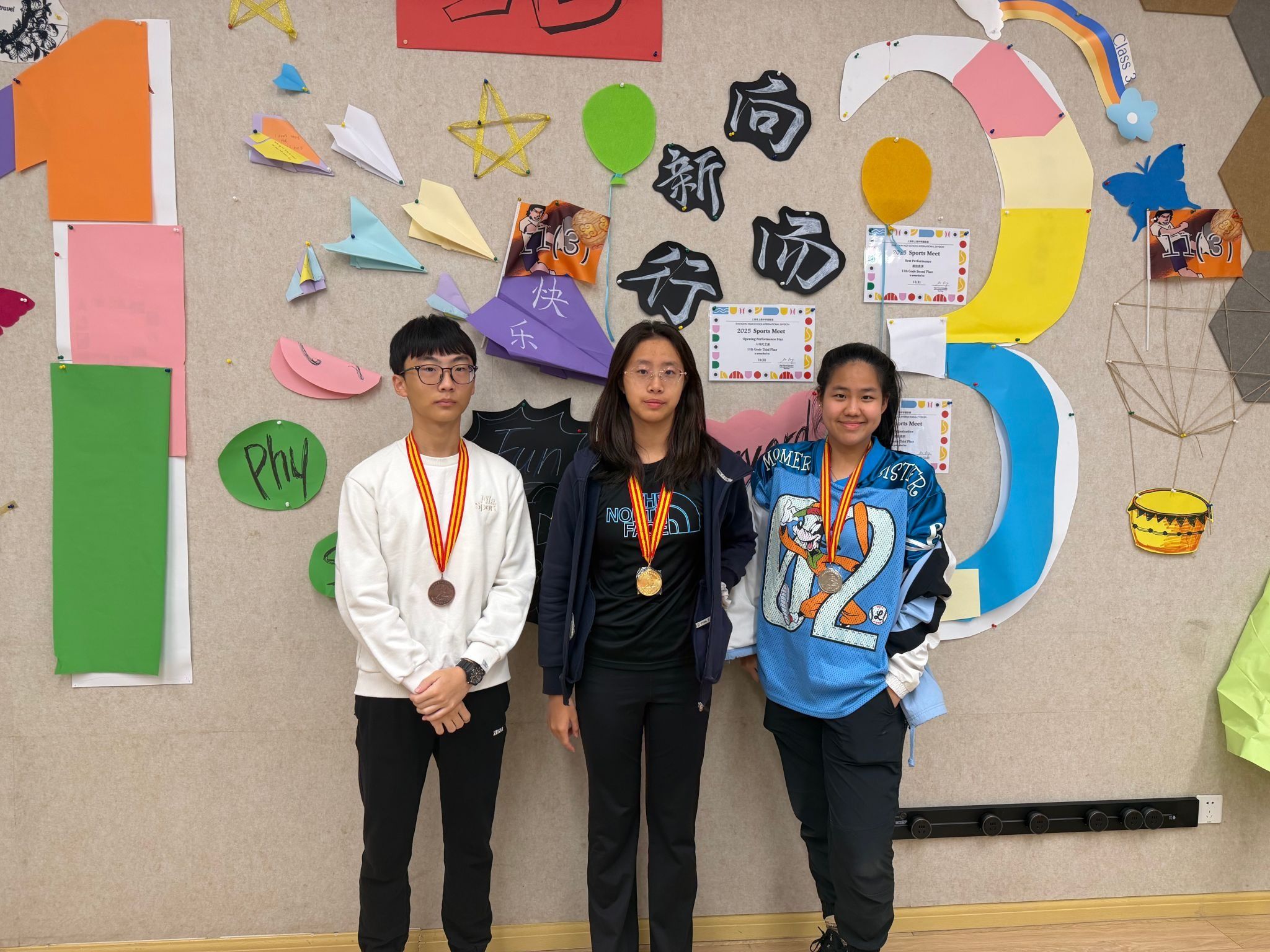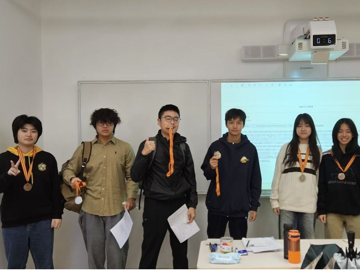 当获奖名单一一被念出时,掌声与欢呼在教室间回荡,同学们纷纷为身边的朋友送上祝贺。获奖者们则饱含笑容举起闪闪发亮的奖牌合影留念。