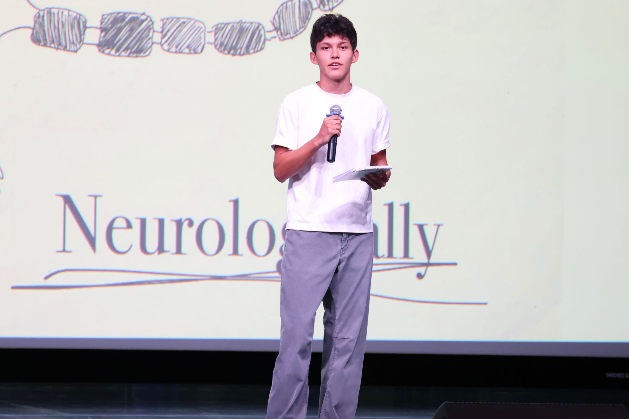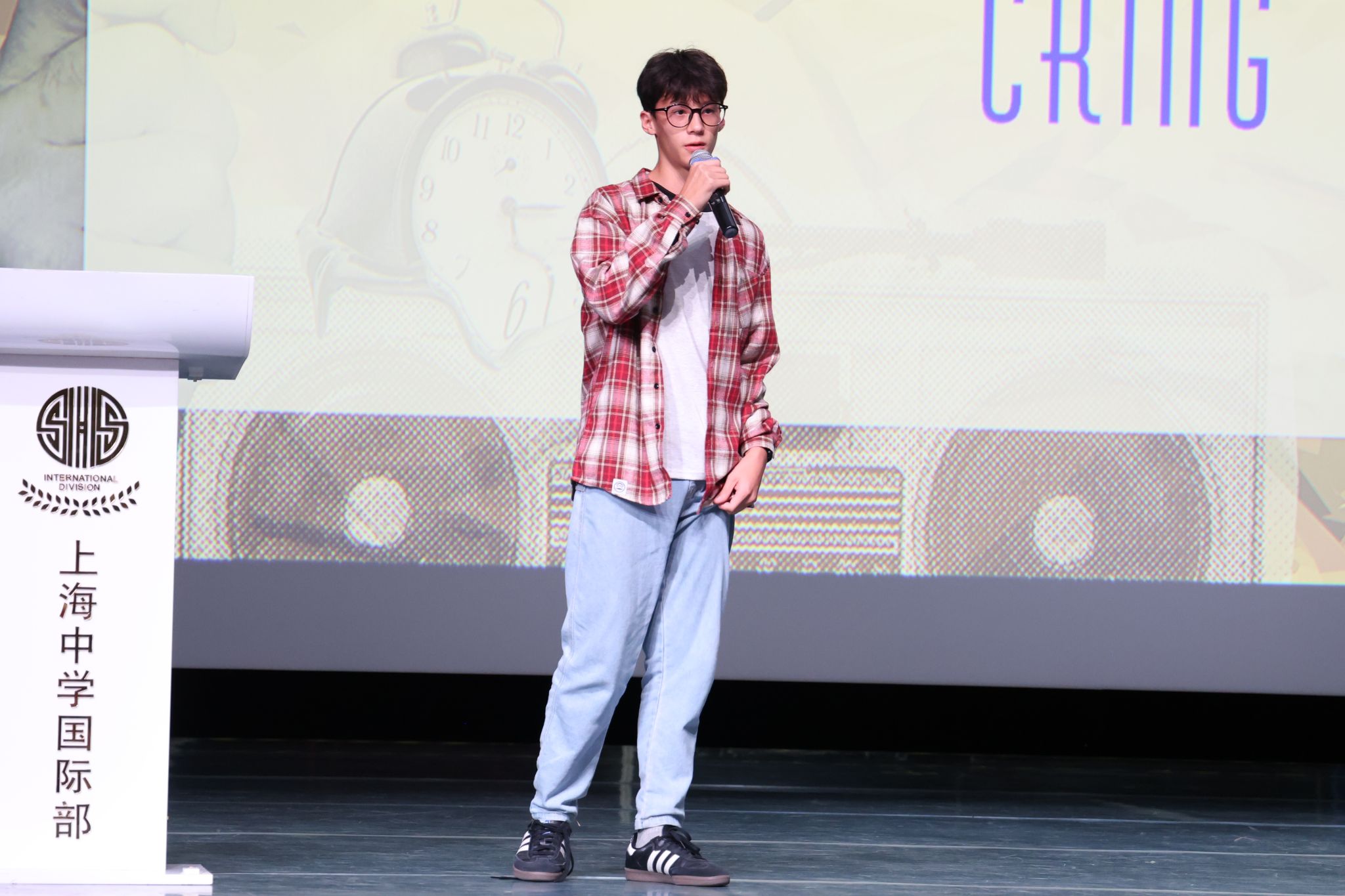 十年级的同学在演讲台上同样展现了多元的风格,描绘出各异的思想图景。有同学构建了一个“选择性记忆”的世界,指出那些令人不堪回首的尴尬记忆,其实多是宝贵的经验,不应一味逃避;有同学以幽默的口吻介绍了鲜为人知的“地平说”,引得台下阵阵笑声与欢呼;也有演讲者通过“若存在让人无需睡眠的药物”这一假设,反思放松与想象力的重要性,引发了观众的低声讨论与共鸣;还有演讲者从神经传输机制入手,指出在当今时代,人们更需要培养共情能力与团结精神。