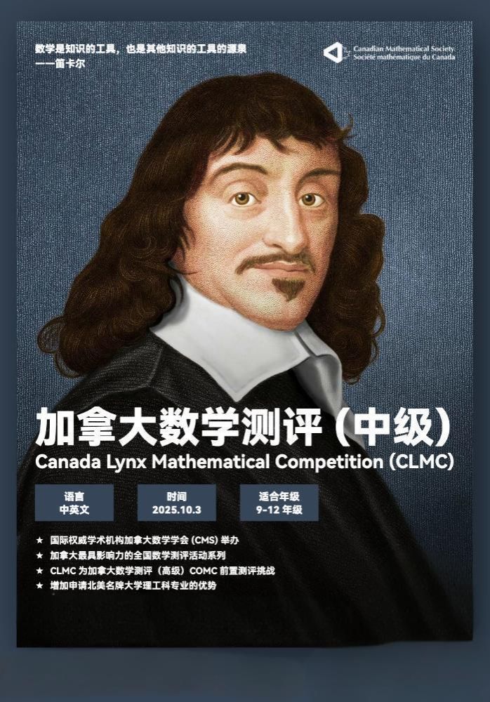 加拿大数学测评,由加拿大数学会CMS (Canadian Mathematical Society)举办,是加拿大最具影响力的全国数学测评活动。它分为初级、中级、高级,分别对应CJMC, CLMC, COMC。加拿大数学测评(中级)(Canada Lynx Mathematical Competition, CLMC)是一项面向9-12年级中学生的数学测评活动,是加拿大数学测评(高级)COMC的前置挑战,考察范围贴合课本,旨在激发学生的数学兴趣和数学技能。