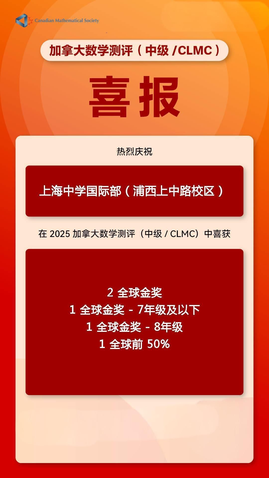 学科竞赛 | 2025 学年加拿大数学测评(中级CLMC)获奖通知