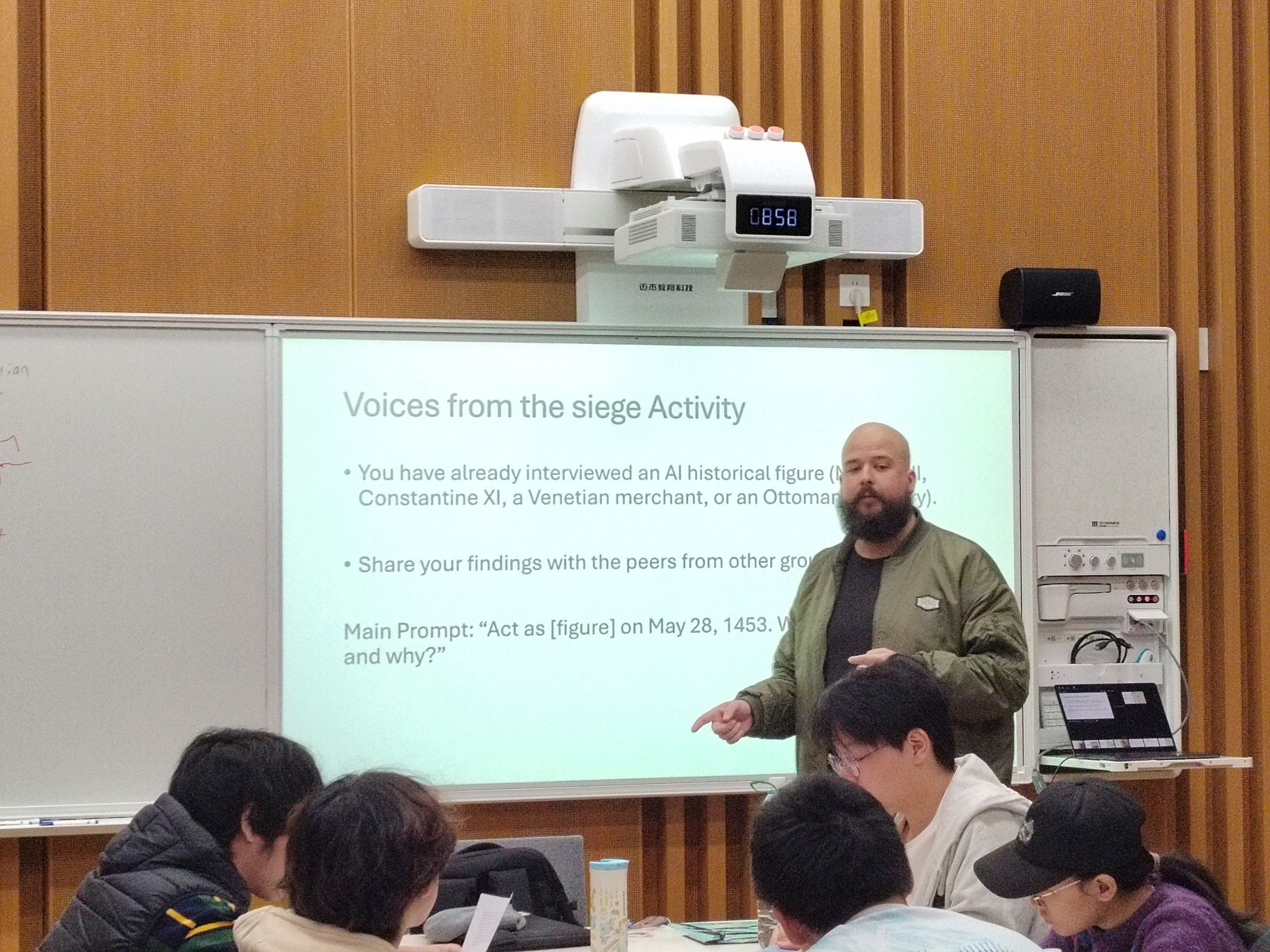 11月24日上午,Cody Turner老师带来了以“拜占庭帝国灭亡”为主题的历史公开课。此课以整合人工智能实现历史角色访问及事件重建,继而进行反思为亮点,以学生为中心,旨在通过生动的历史场景还原,多视角的人物解读,帮助学生理解和掌握拜占庭灭亡所牵连之广以及相应后果。