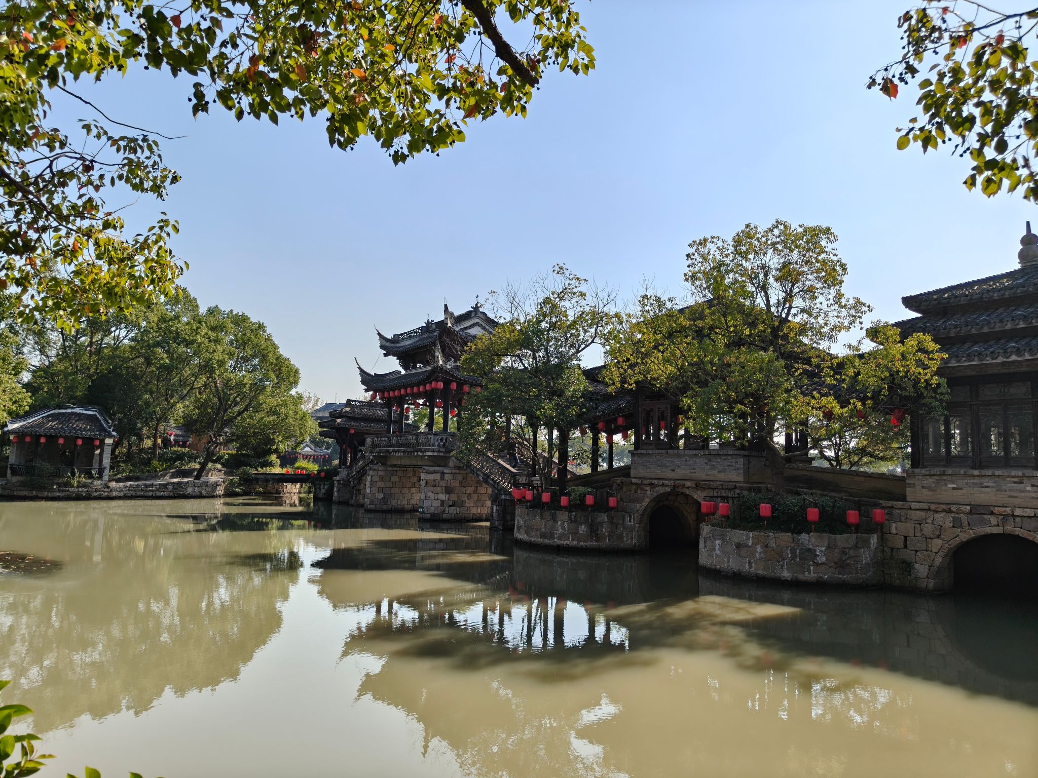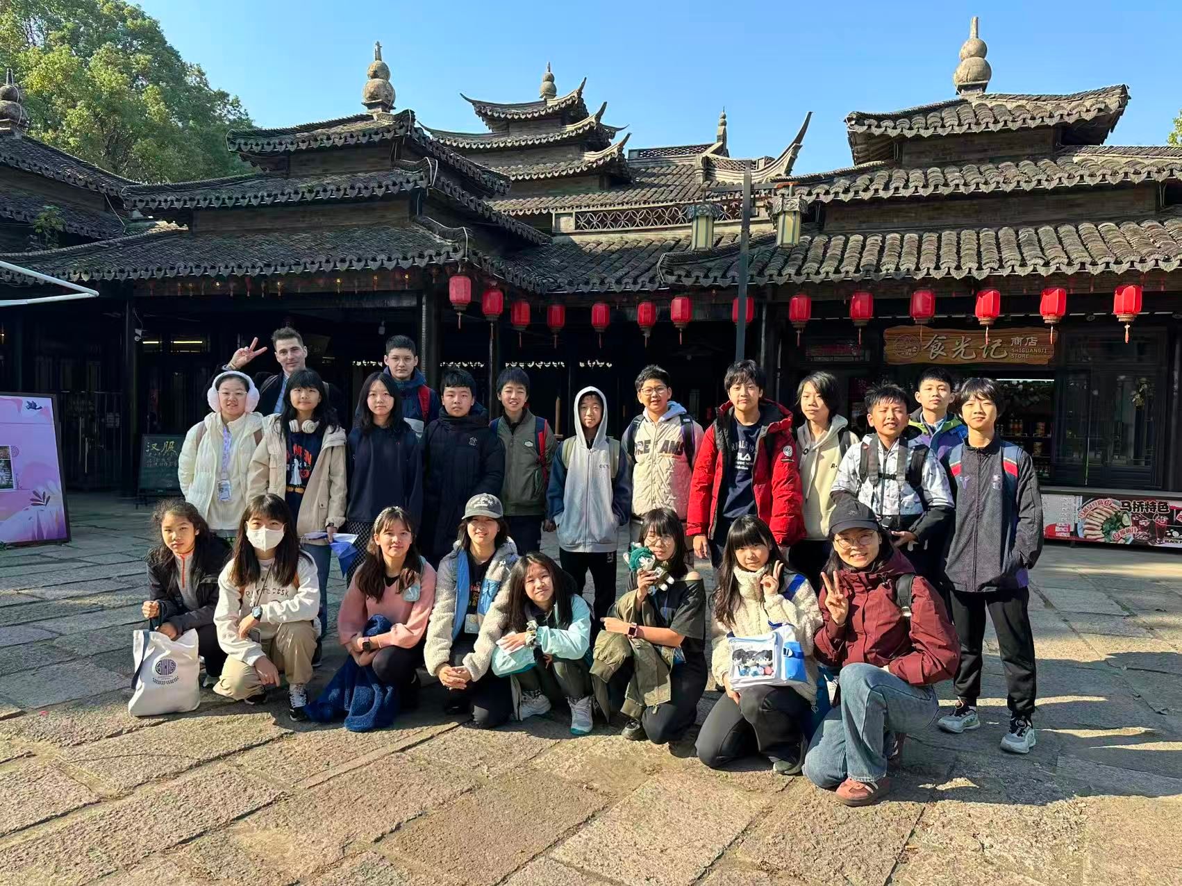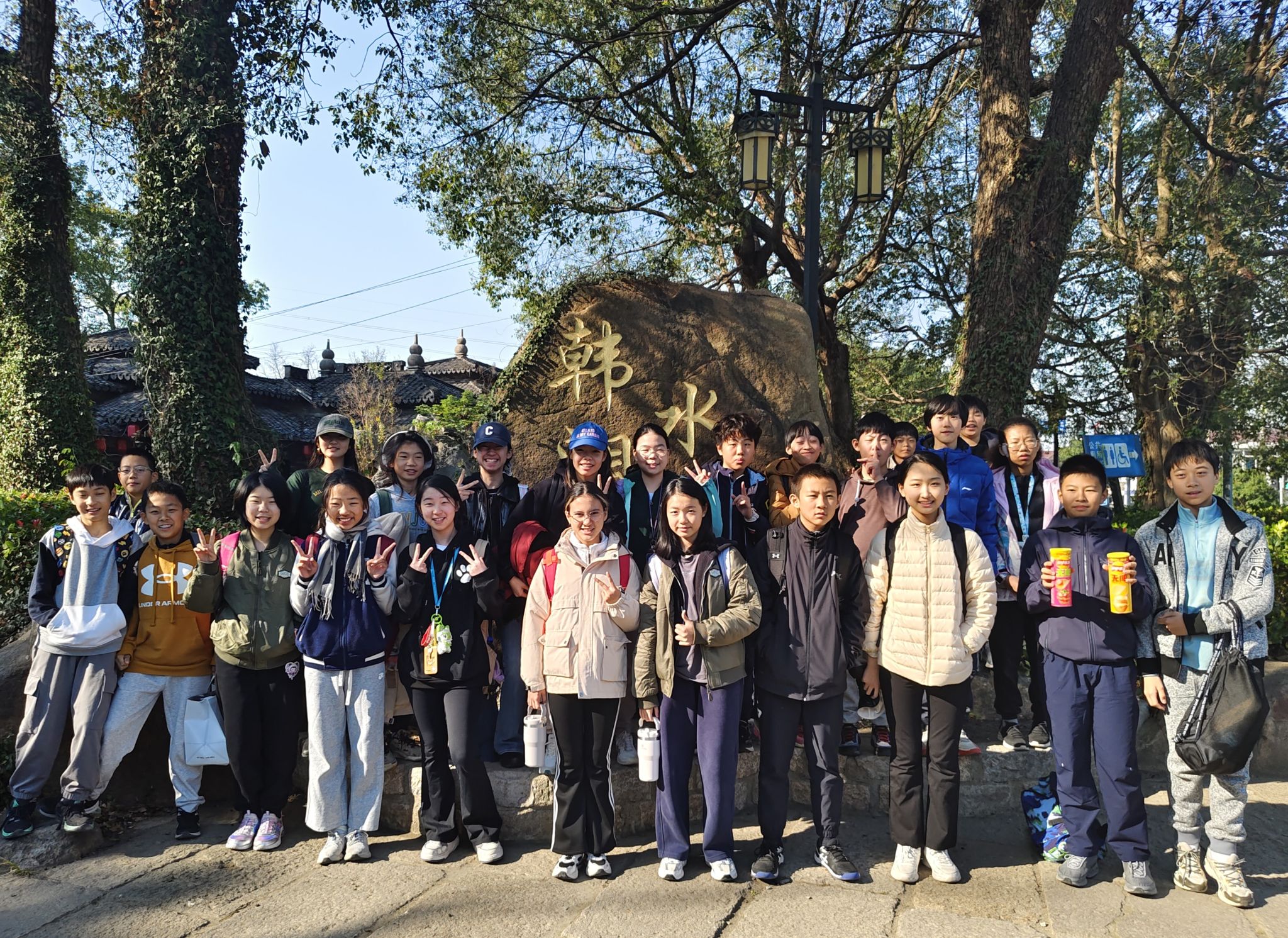 抵达园区后,队伍沿着蜿蜒的水畔步道缓步前行。青石板路串联起一座座古桥,各具姿态,倒映在水面上。同学们漫步其间,不时驻足观察桥身的纹饰,讨论不同桥梁的结构特点。古树掩映着白墙黛瓦,空气中仿佛流动着岁月的痕迹,使这段步行成为自然与人文交织的沉浸式体验。