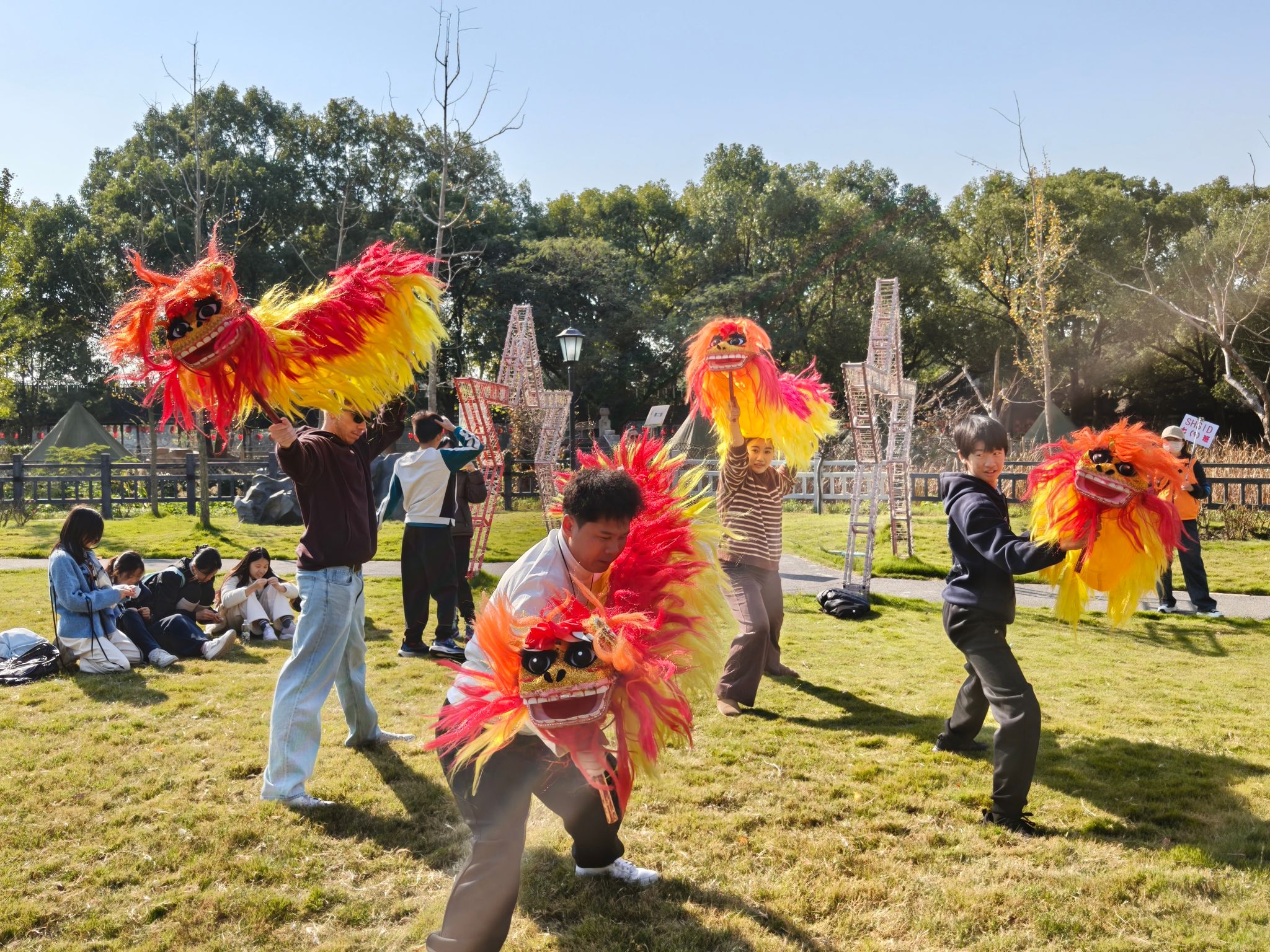 非遗手狮舞活动成为当天的亮点之一。在观赏手狮舞表演后,同学们也跃跃欲试。他们双手操控彩狮道具,尝试“晃狮”“摇狮”等基本动作。起初略显笨拙的姿势逐渐变得娴熟,几只“小狮子”在场地上跳跃、打滚,活灵活现。通过亲身体验,同学们更直观地感受到了这项传统民俗艺术的魅力。