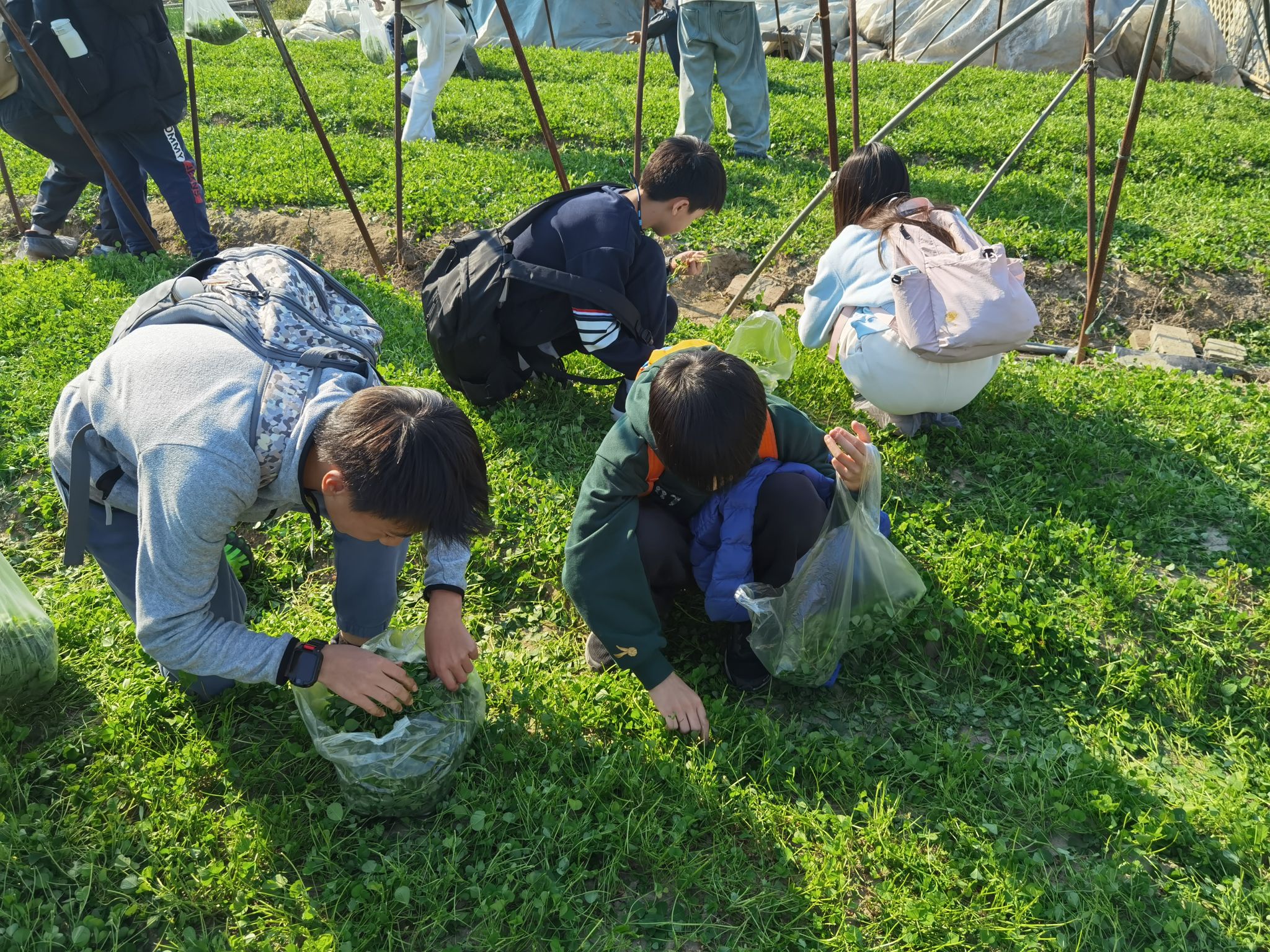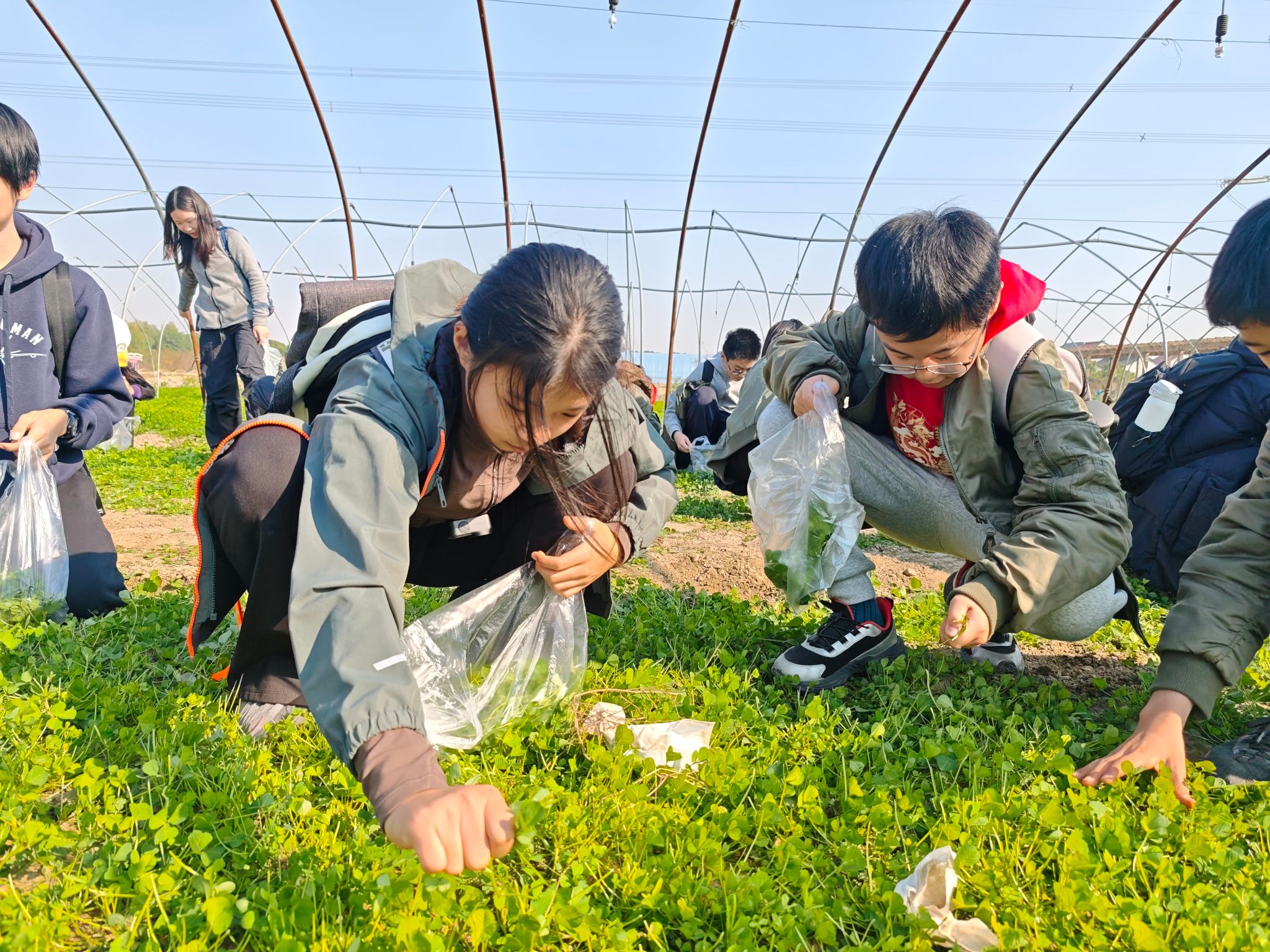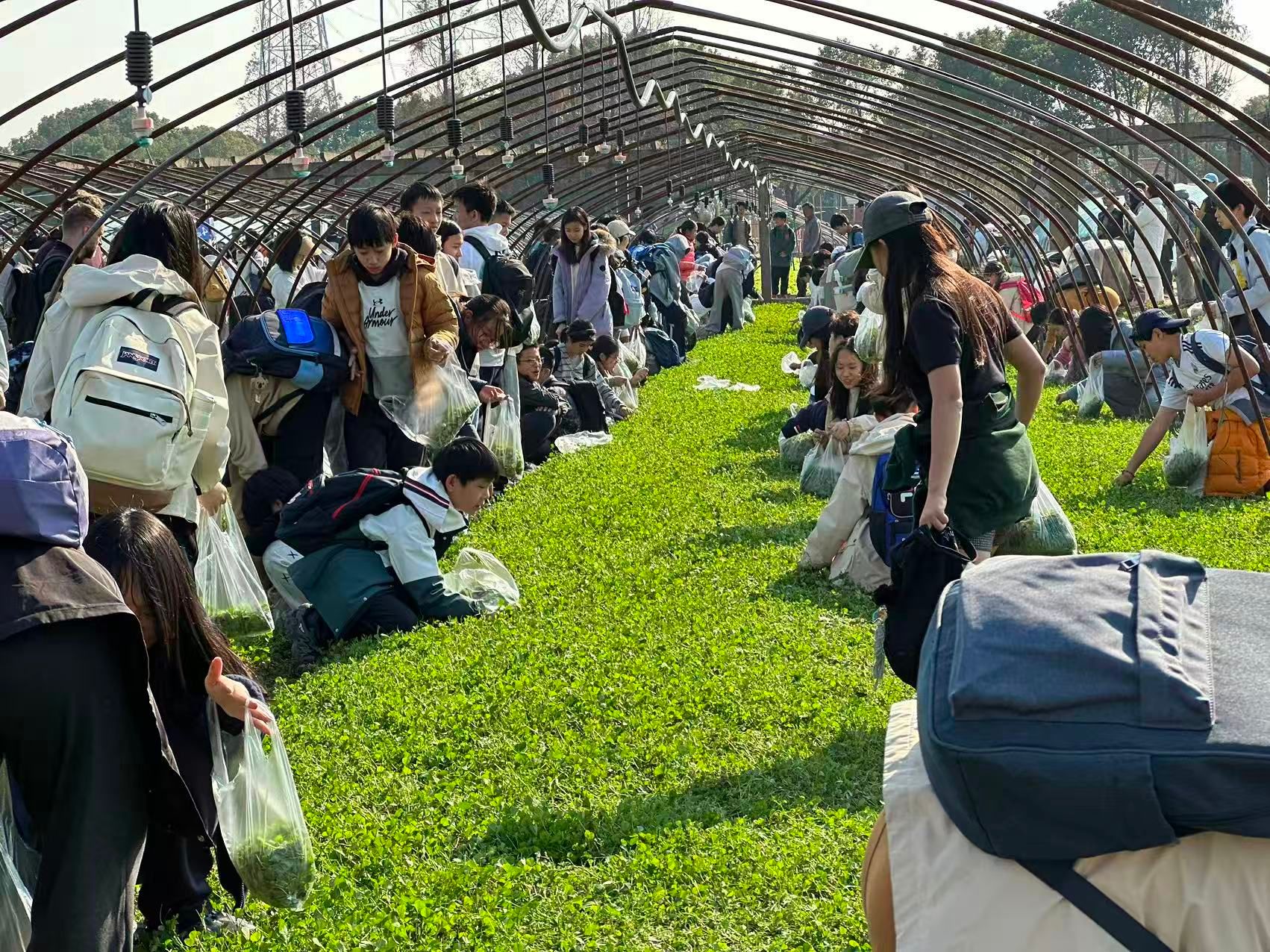 在完成水博园的参观后,同学们满怀期待地来到了种植园,采摘成为秋游中最亲近自然的体验。同学们满怀着好奇观察耕地中种植的草头,仿佛每一片叶子、每一缕泥土的香气都在诉说着大自然的奇妙。同学们伸出双手,小心地从枝叶间掐下饱满的菜叶。随着一片片新鲜的菜叶落入袋中,袋子的重量一点点增加。土地的温度、植物的触感与收获的喜悦在此刻变得格外真实。