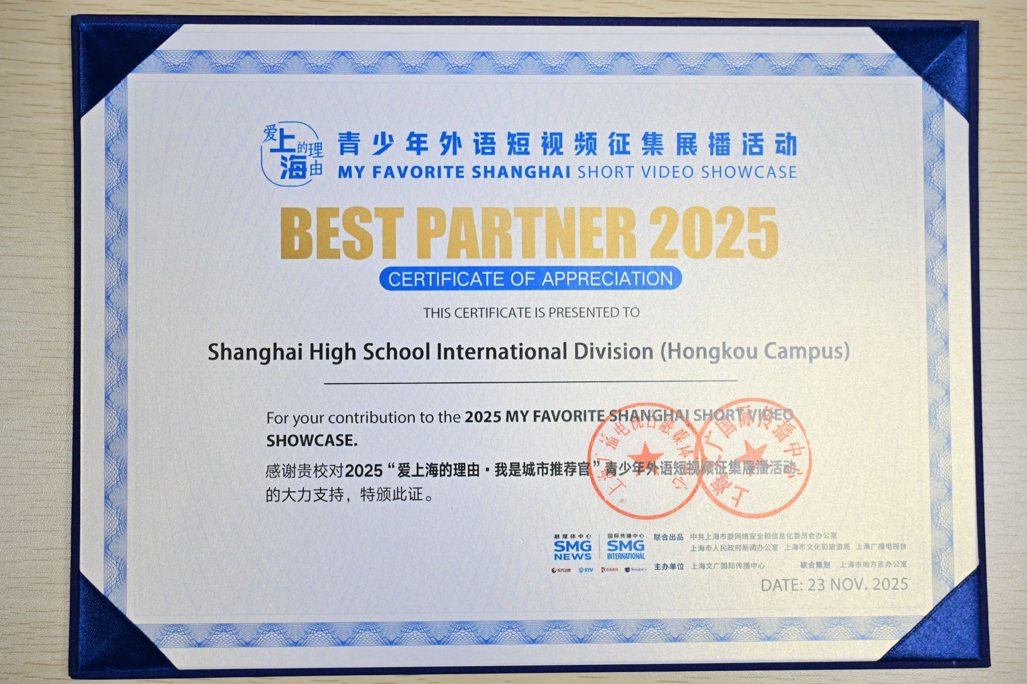 在本届高手云集的活动中,上中国际部虹口校区表现卓越。从全校踊跃投递的20余部作品中,5部视频脱颖而出,斩获专业奖项。这些作品不仅视角独特、制作精良,更以流畅自信的外语表达,传递出深厚的文化认同与跨文化沟通能力。此外,四位同学荣获“明日之星”奖,虹口校区也荣膺大会“最佳组织奖”,实现了参赛成绩与组织工作的双丰收。