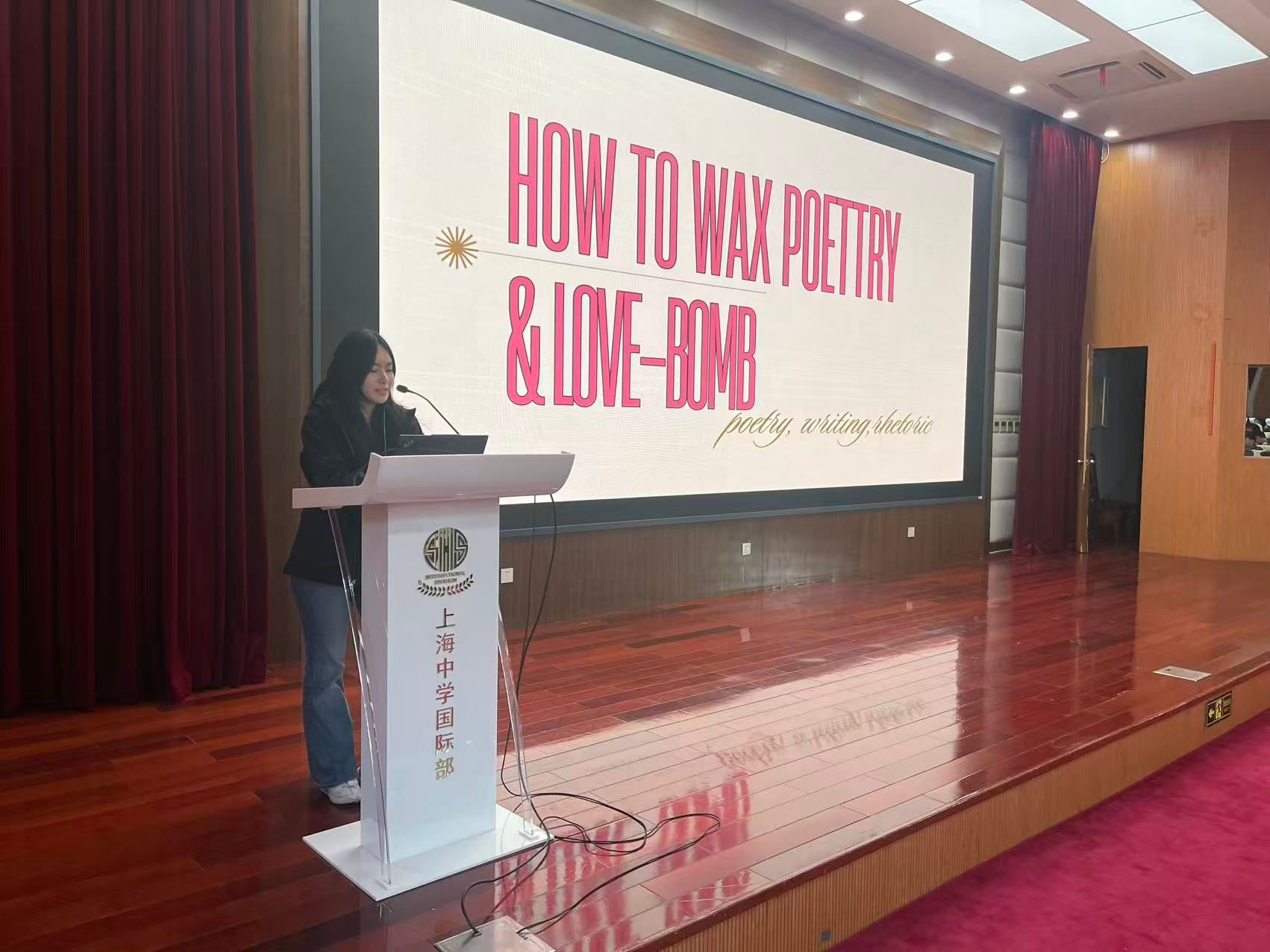 来自12(1)班的黄同学上台分享了她在写作方面的兴趣。她先后展示了自己在9年级时和近期的诗歌作品,总结并反思了自己写作历程中的成长与进步。她指出,所有写作都需要反复修改,因为每一个词汇、每一句话都是作者精心挑选、斟酌的结果,世界上没有完美的初稿。