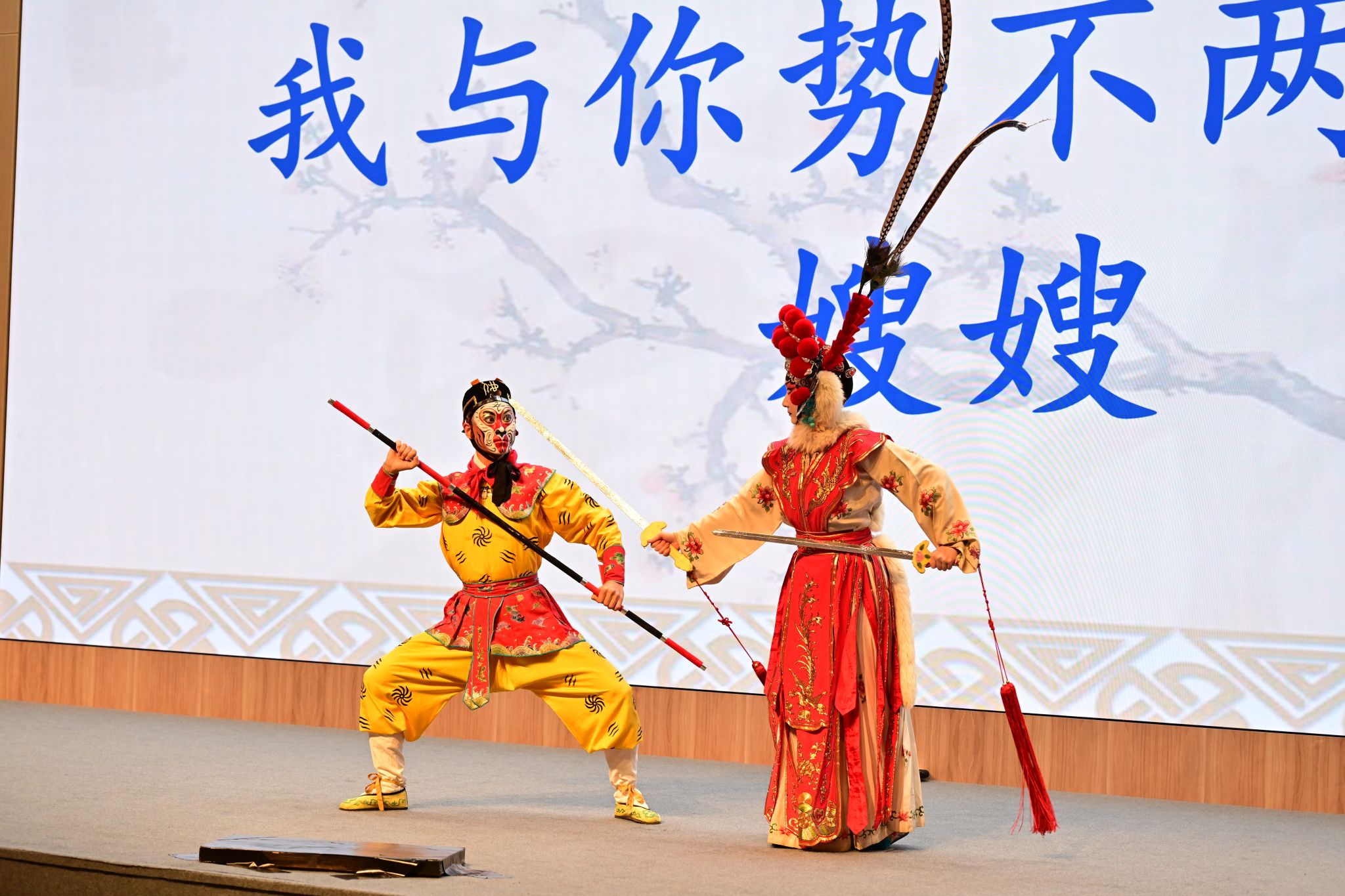 好戏开始啦!首先亮相的是经典剧目《借扇》,它改编自同学们耳熟能详的《西游记》中孙悟空“三借芭蕉扇”的故事。《借扇》最精彩的是打戏,饰演孙悟空的赵宏运老师一展其扎实的武生功夫,在与铁扇公主的攻防中对决紧凑、节奏激烈,将猴王的好斗与机敏展现得淋漓尽致。饰演铁扇公主的廖静娴老师,气场全开,以清亮的嗓音,铿锵的念白,展现了武旦的飒爽英姿。值得一提的是,赵宏运老师专门为同学们展示了武生的打斗动作,手中的金箍棒舞动生风、轻灵迅捷,赢得同学们阵阵喝彩。