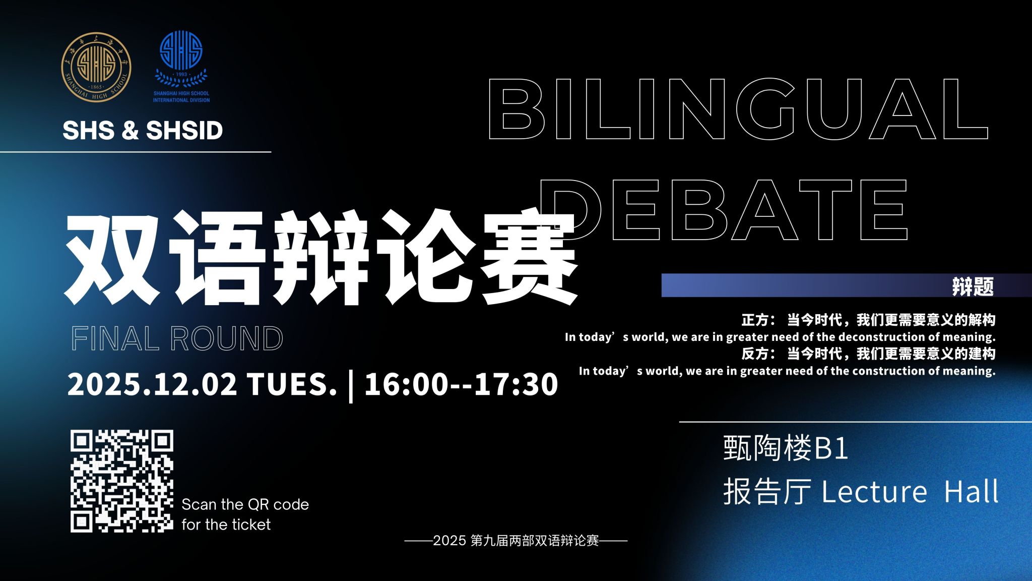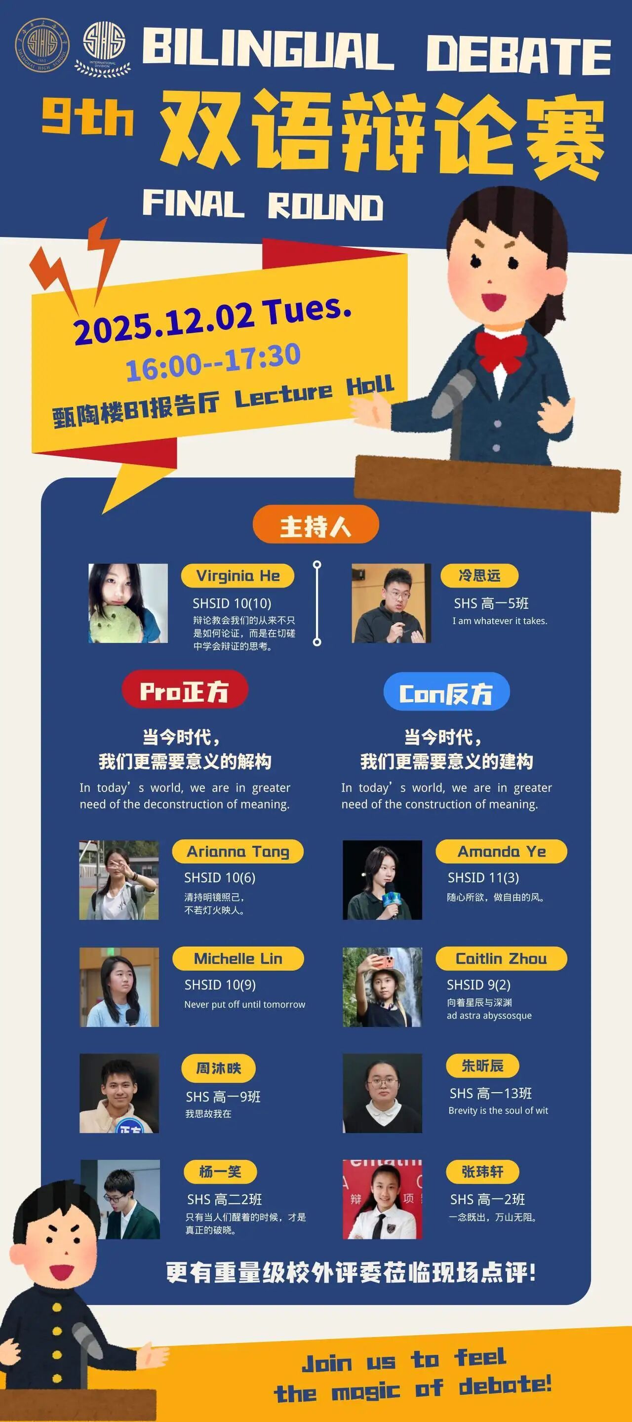 2025年11 月,第九届双语辩论赛在上中校园内再次紧锣密鼓地拉开帷幕。令人欣喜的是,许多新面孔加入了两部双语辩论赛的大家庭,为比赛注入了新的活力与创意。经过一个多月的激烈角逐与思想交锋,第九届两部双语辩论赛即将迎来年度决赛。自创立以来,双语辩论赛始终致力于加强两部同学间的沟通与合作,而独特的双语赛制也促使选手们在中英文之间自由切换,使思维迁移更加自然顺畅,展现出卓越的表达能力与严谨的逻辑思辨力。