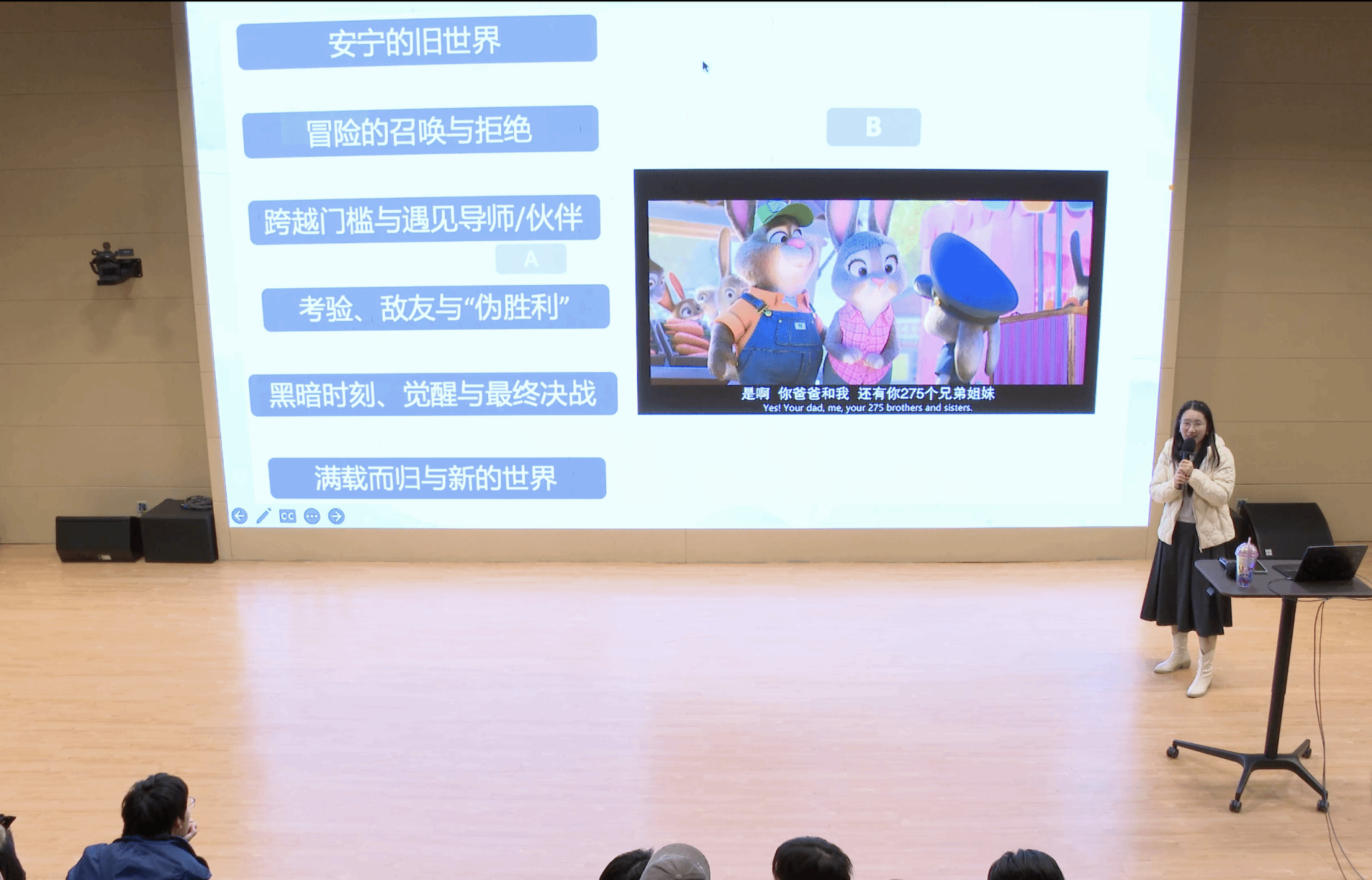 仝老师的故事工坊则是一场创意与实践的碰撞。课程从“一句话故事”的热身创作开始,迅速点燃了学生的表达欲。随后,仝老师巧妙引入了弗莱塔格金字塔、费希特曲线和英雄之旅三种经典故事模型,并以学生们耳熟能详的《长安的荔枝》、《疯狂动物城》等作品为例,清晰拆解了模型的应用方法。在“学以致用”环节,学生们热情高涨,纷纷拿起笔,运用刚学的“公式”进行故事框架构思。短时间内,一个个充满奇思妙想的故事大纲便跃然纸上。现场创作氛围浓厚,学生们纷纷表示:“没想到写故事也能像解数学题一样有逻辑可循,感觉创作的门槛一下子降低了,特别有意思!”仝老师总结道,本课旨在激发创作兴趣,并让大家认识到,在这个时代,优秀的故事本身就是一种强大的生产力。