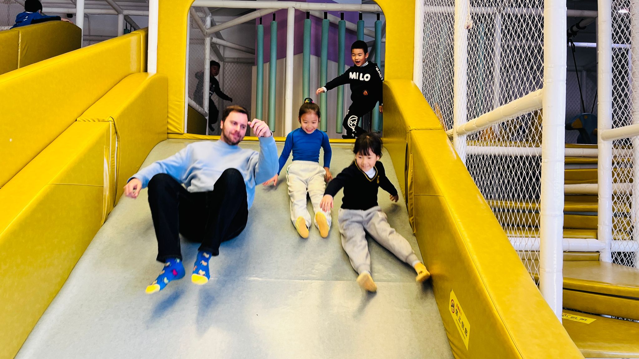 二年级的孩子们踏入季高兔窝窝亲子园,瞬间便像闯进了一本鲜活灵动的童话书。兔宝堡前,巨大的兔子造型装置堪称全场焦点:滑梯顺势而下,攀爬网纵横交错,孩子们在上面尽情奔跑、攀爬、滑行,将满满元气尽情释放,欢快的欢呼声此起彼伏,响彻园区。竞速场更是点燃了孩子们的热情。碰碰车相撞时迸发出阵阵欢乐火花,脚踏车沿着赛道一圈圈向前飞驰。速度与快乐并肩同行,孩子们的笑脸在秋日暖阳下格外灿烂耀眼。捕梦网下,彩虹弹跳枕和大爬网色彩绚丽夺目。孩子们纵身跃起、灵活穿梭,像一朵朵轻盈的 “小云朵” 在缤纷世界里自在遨游,尽情享受跳跃与攀爬带来的酣畅乐趣。