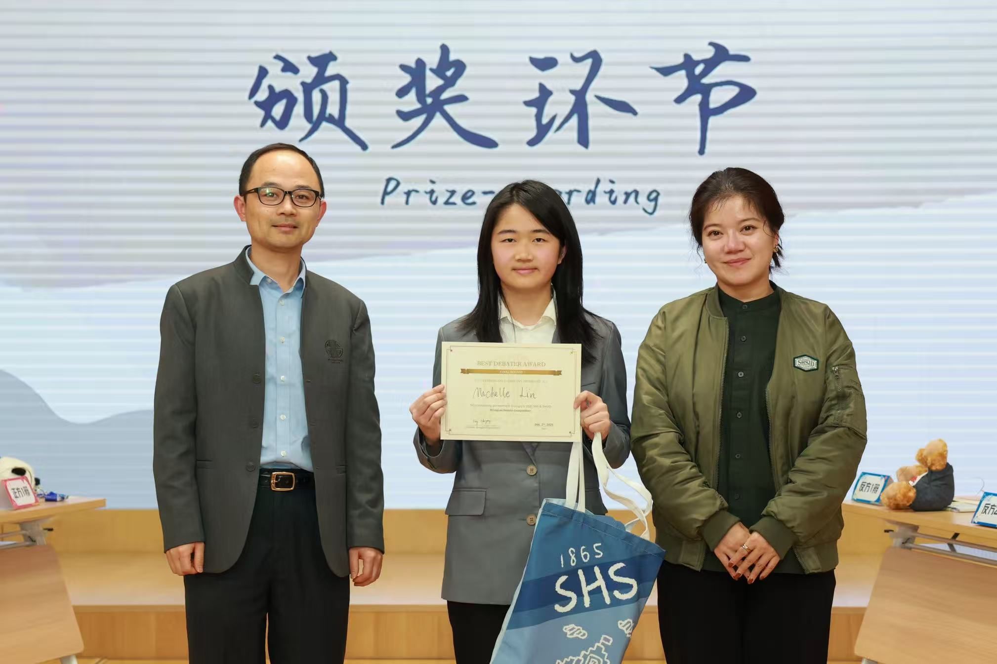 综合评议后,反方队伍凭借严密的论证体系与扎实的现实支撑,获得本届比赛冠军。正方二辩、来自国际部的 Michelle 同学凭借卓越的表达能力与临场思辨,被评为本场 “最佳辩手”。