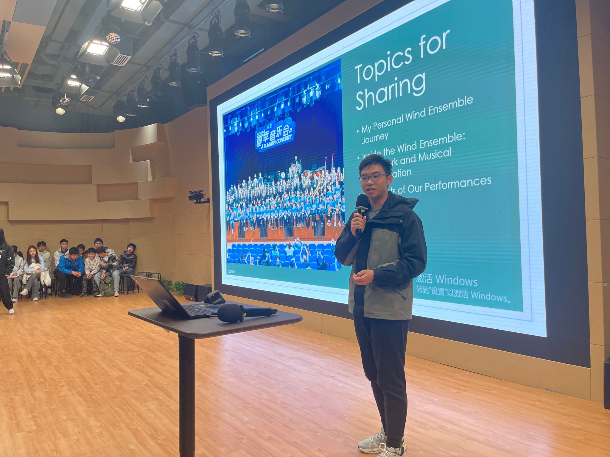 五年级刚加入管乐团时,他经验有限但热情十足。正是在这里,他很快认识到合奏演奏远不止于个人技术,它需要专注的聆听、持续的调整和紧密的协作。金同学接着描述了乐团丰富的声部构成,包括木管乐器(如长笛、单簧管、萨克斯)、铜管乐器(如小号、长号、圆号),以及打击乐、上低音号和低音提琴。他解释了每个声部如何为乐团整体贡献力量。