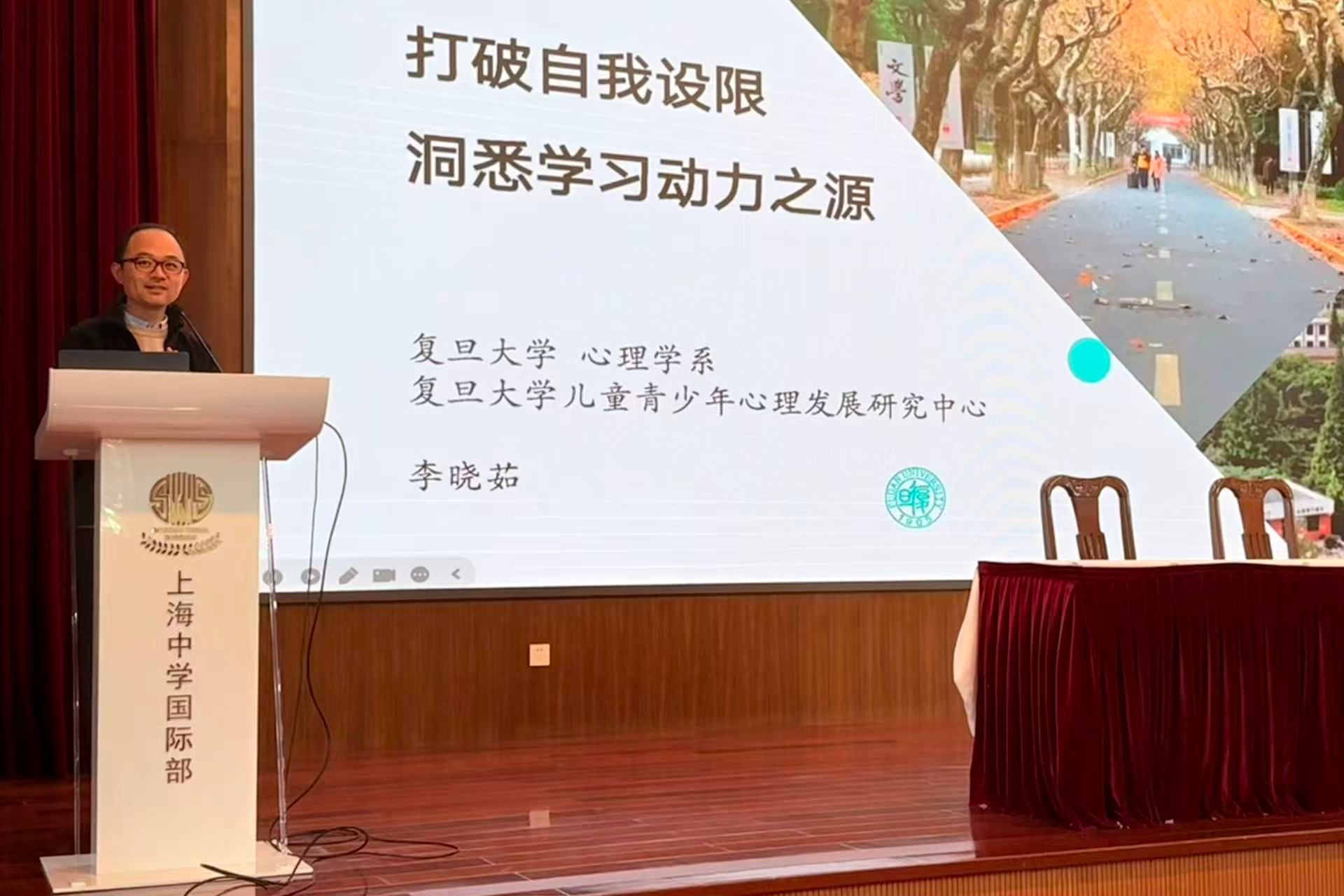 12月3日中午,上海中学国际部高中段在先棉堂辅楼礼堂成功举办了一场“打破自我设限,洞悉学习动力之源”主题讲座。特邀复旦大学心理学系教授、博士生导师、中国心理学注册系统督导师李晓茹老师担任主讲,吸引了众多高中段学生与家长到场参与,交流氛围热烈。讲座由高中段校长马峰老师主持。