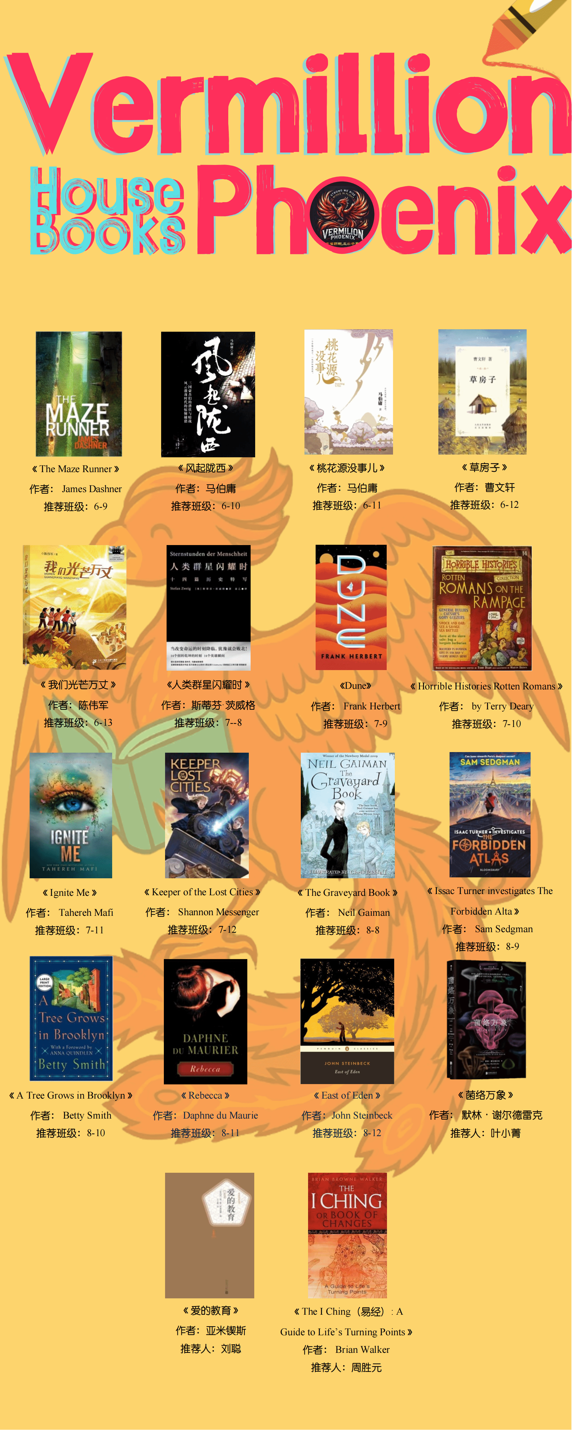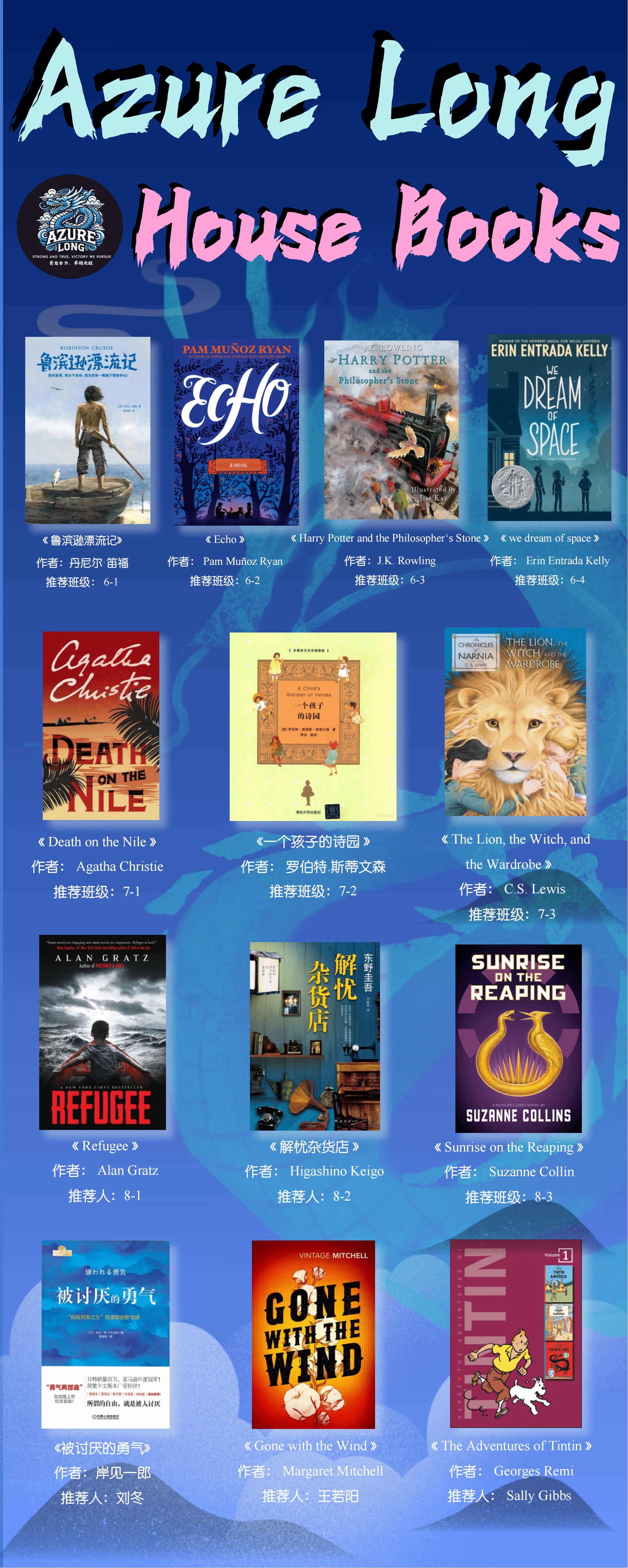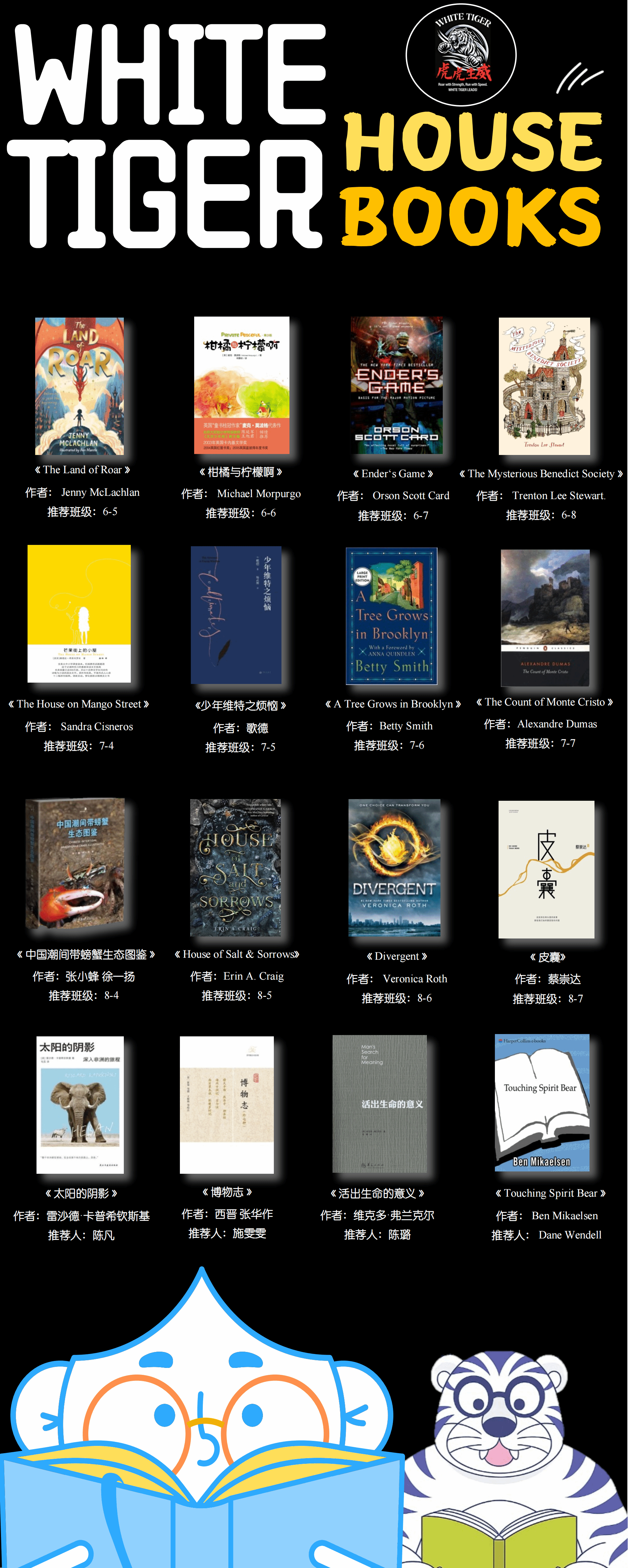 新学期伊始,青龙、白虎、朱雀三个House的各个班级与老师们纷纷推荐了自己心中适合学生阅读的一本书,共同组成了本年度的“House推荐书单”。这些书籍类型多样,有的充满奇幻色彩,有的贴近生活哲思,也有的涉及历史与科学领域。书单海报张贴出来后,时常能看到同学们在课间聚集在前,一边浏览书目,一边交流想法。九月的书单像一扇扇悄然打开的门,轻轻引领他们探寻文字深处的风景,也为这一学期的阅读旅程正式按下启动键。