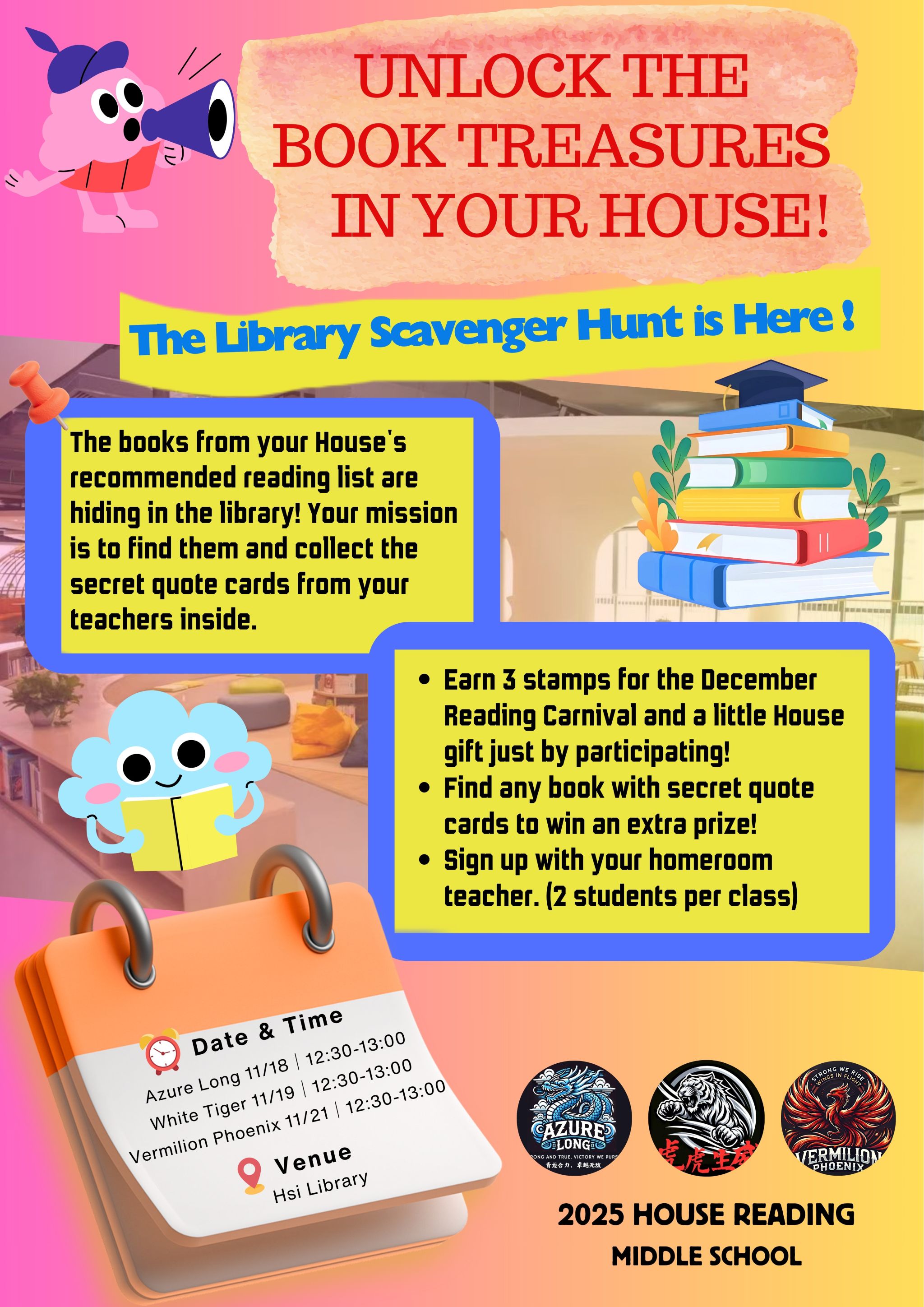 金风渐起,书香盈堂。2024—2025学年,初中段以House为单位,重磅推出贯穿整个学期的2025 House Reading之“BOOK思意”系列活动。从九月的书单启航、十月的师者沙龙、十一月的图书馆寻宝与专家讲座,到十二月压轴亮相的阅读嘉年华,四大篇章层层递进,在校园内为学生搭建了一场融合阅读、互动与体验的成长旅程。整学期的活动既有静心阅读的沉淀,也有交流分享的碰撞,更有亲身参与的乐趣,让阅读以更加多样、生动的方式融入学生的日常学习与生活。