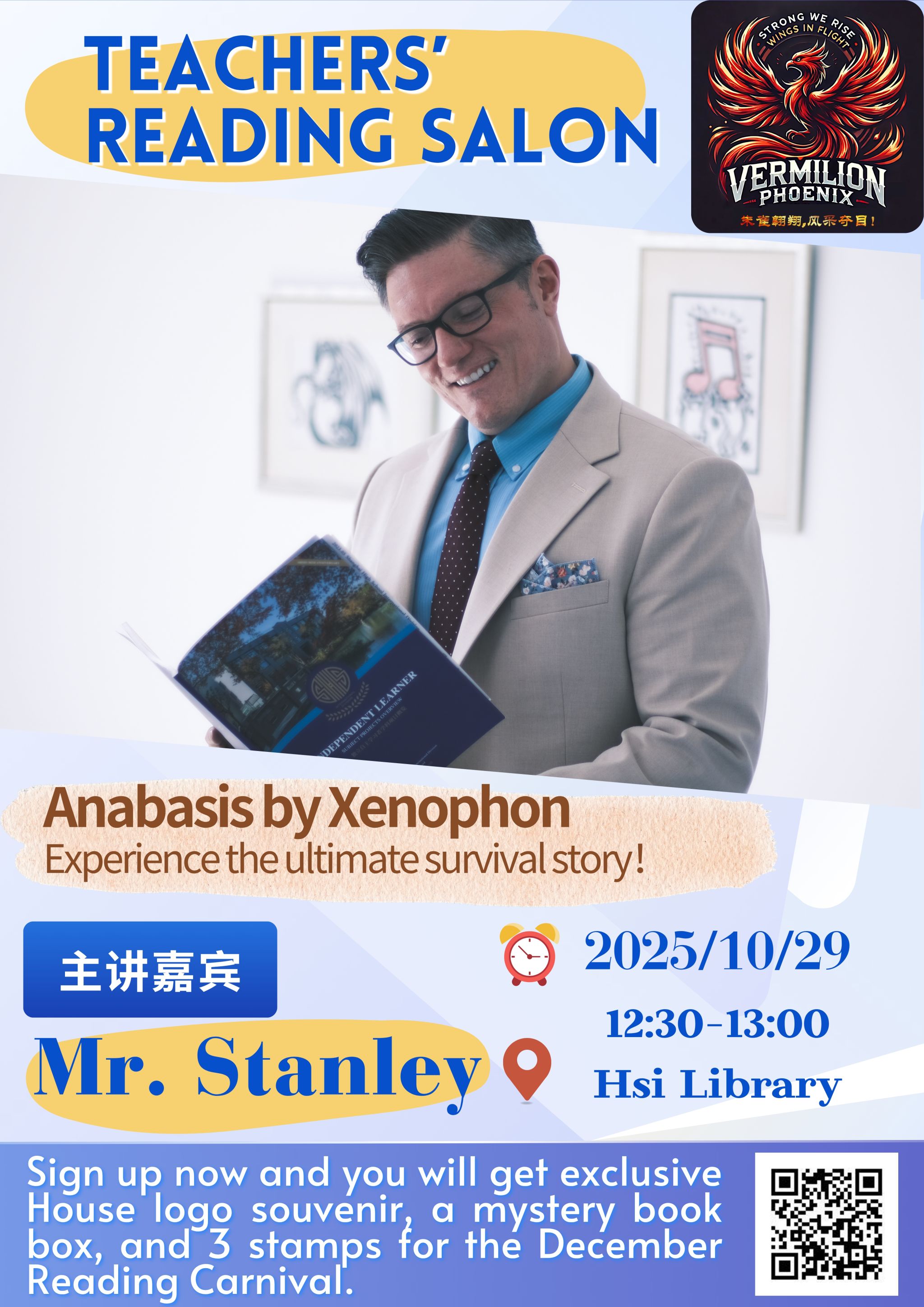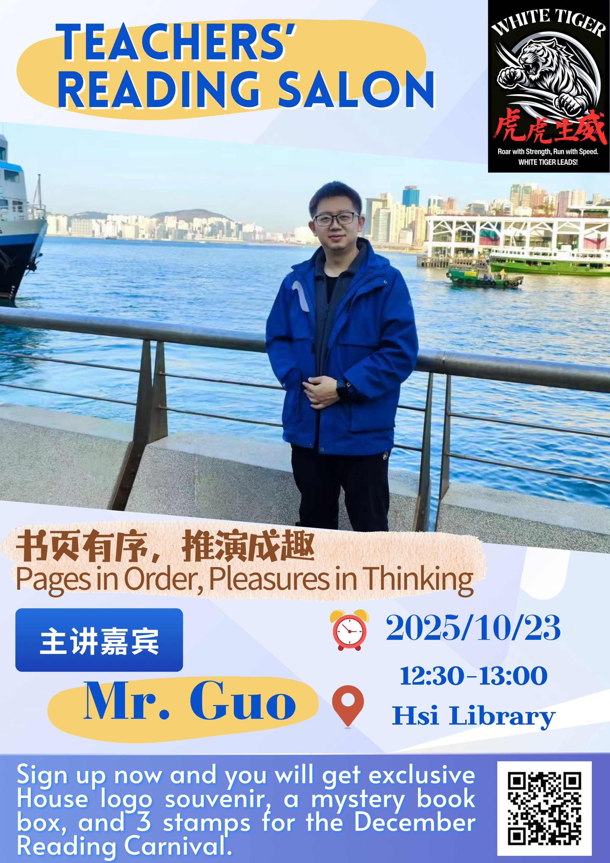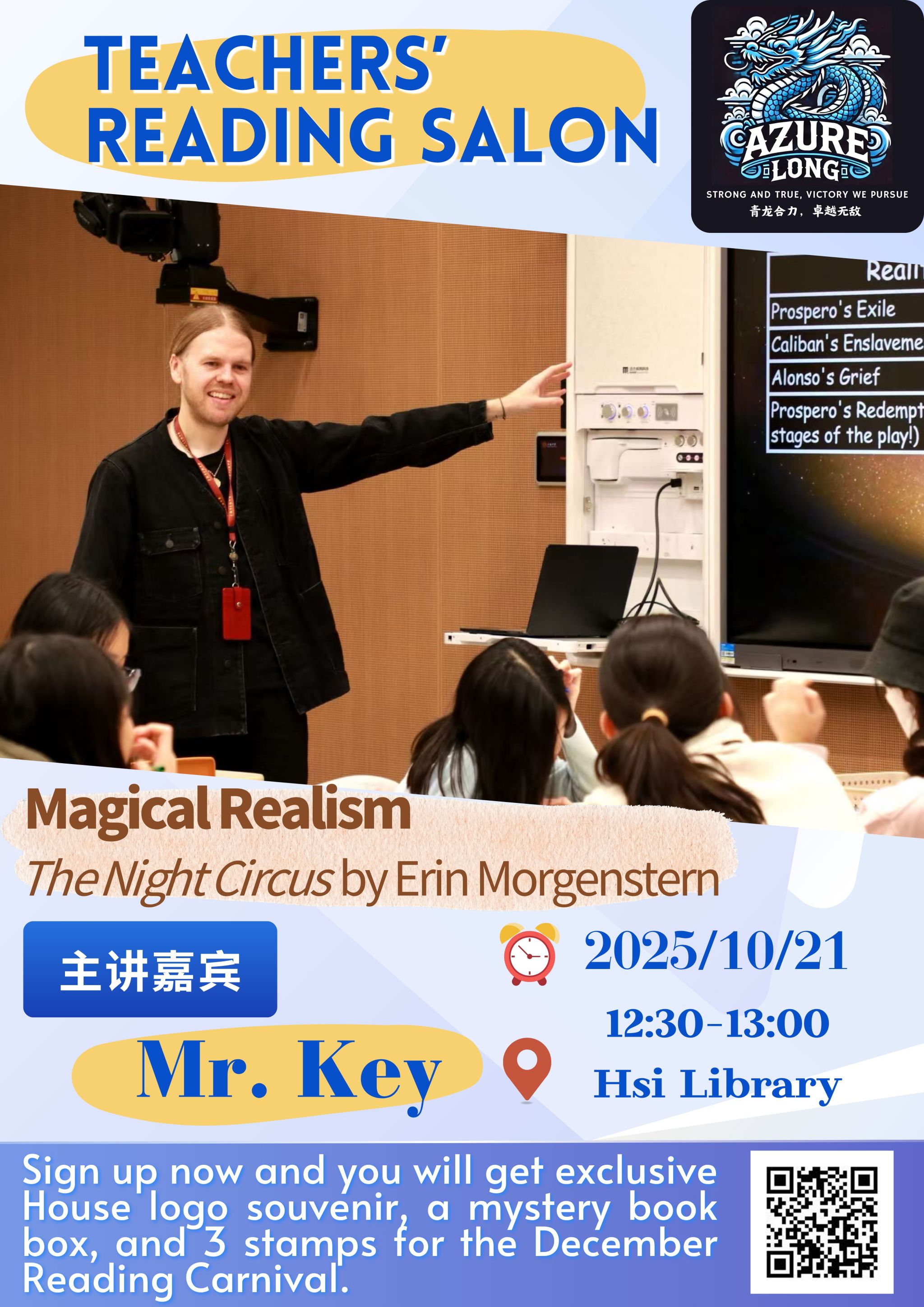在金桂飘香、清风朗朗的十月,同学们期待已久的“老师阅读沙龙”也正式启动。特别的是,这次上台分享的三位老师完全由学生线上投票选出,成为大家“自己想听的阅读引路人”。青龙House的Mr. Key以《夜行马戏团》开启序幕,他通过沉浸式片段朗读,让学生在奇幻与现实的交界处自由游走,感受到魔幻现实主义语言的魅力;白虎House的Mr. Guo则以《数学之美》《数学女孩》《博弈论》带来一场跨学科的阅读体验,从语言规律到随机世界,再到合作与竞争的哲学,让学生看到数学也能“温柔且有趣”;朱雀House的Mr. Stanley以戏剧性的讲述方式重述中世纪两位王后的故事,把图书馆变成一座暗流涌动的宫廷舞台,让学生深刻体会历史人物的选择与牵引。三场沙龙既有欢声笑语,也有学生们沉静思考、积极发问的身影。在阅读分享沙龙中, 老师以阅读者的身份出现、学生以思考者的身份参与。这种深度对话使阅读不再只是“任务”,而是理解世界、理解自我、理解人生的方式。